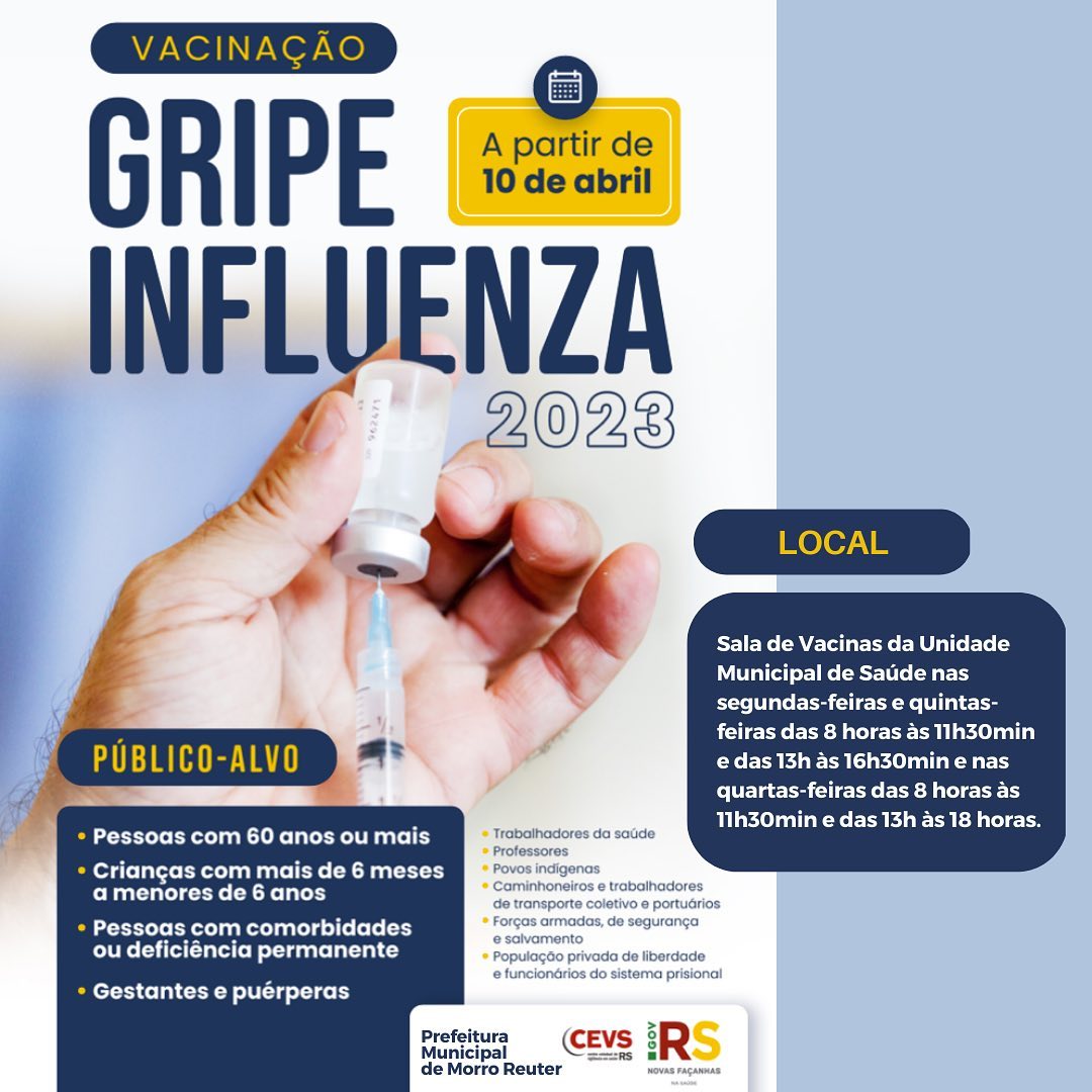 Morro Reuter – Começou a vacinação contra influenza. Em Morro Reuter, o público-alvo desta primeira etapa é de grupos prioritários (confira abaixo) o que abrange 2,3 mil pessoas no município. A aplicação se dará na Sala de Vacinas da Unidade Municipal de Saúde nas segundas-feiras e quintas-feiras das 8 horas às 11h30min e das 13h às 16h30min e nas quartas-feiras das 8 horas às 11h30min e das 13h às 18 horas.