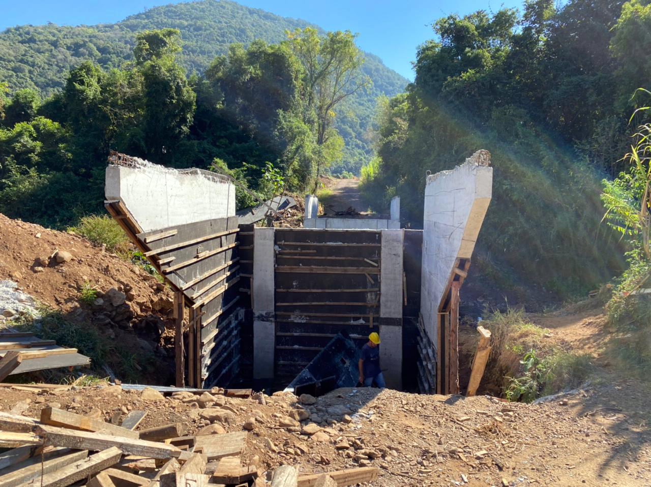 Nova Petrópolis – A construção da nova ponte sobre o Arroio Pirajá, em Linha Pirajá, teve novos avanços nesta semana. A empresa responsável pela obra desformou a estrutura de concreto, retirando as madeiras utilizadas durante a concretagem, que foi realizada no dia 10 de abril. Agora que a estrutura está desformada, a próxima etapa é a colocação de aterro, para formar as cabeceiras. O trabalho será realizado pela secretaria de Obras.