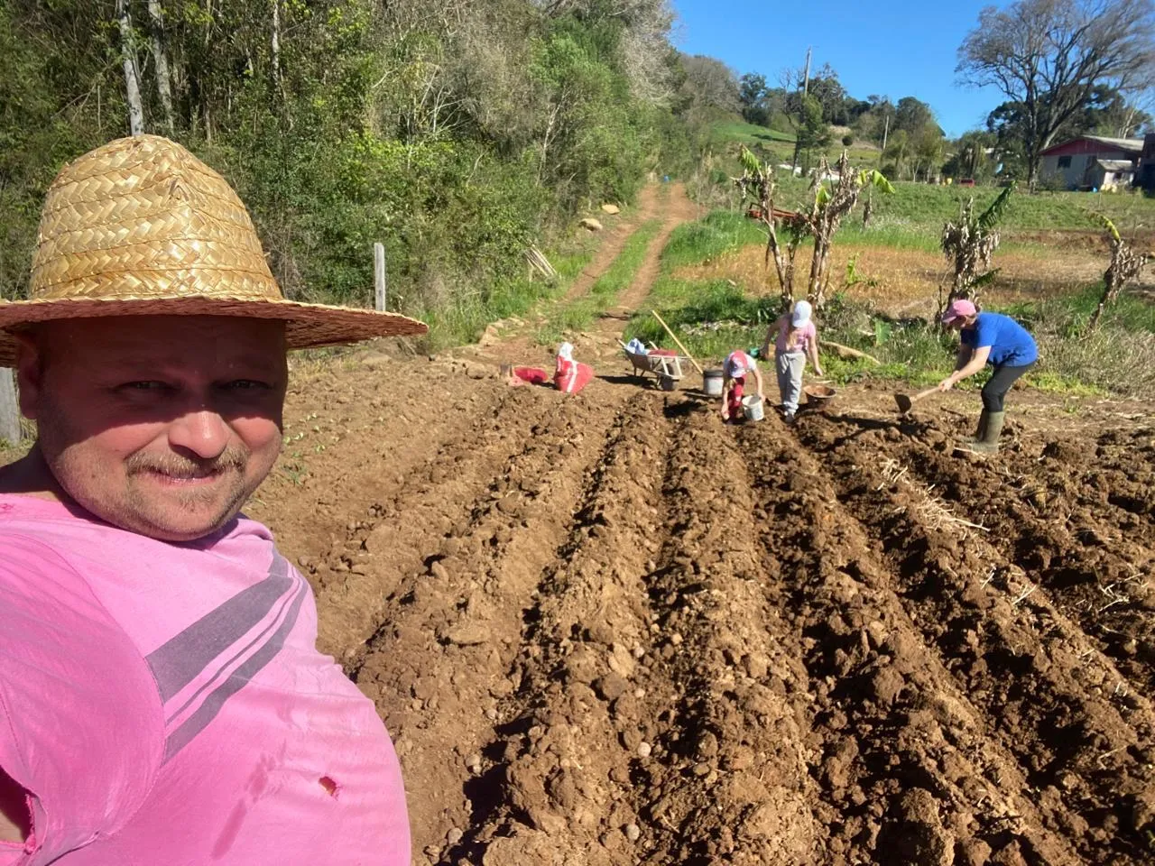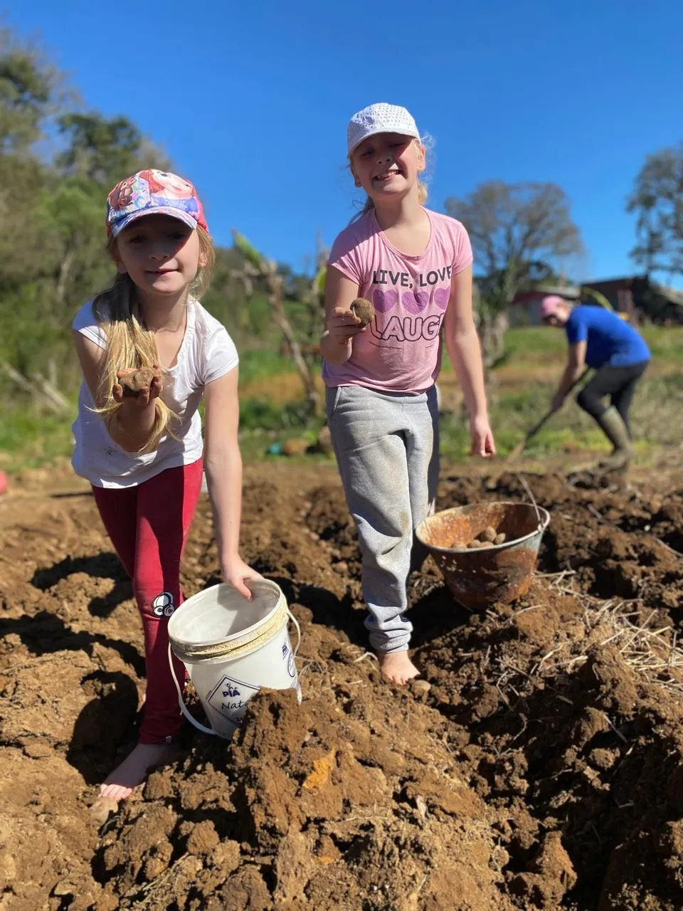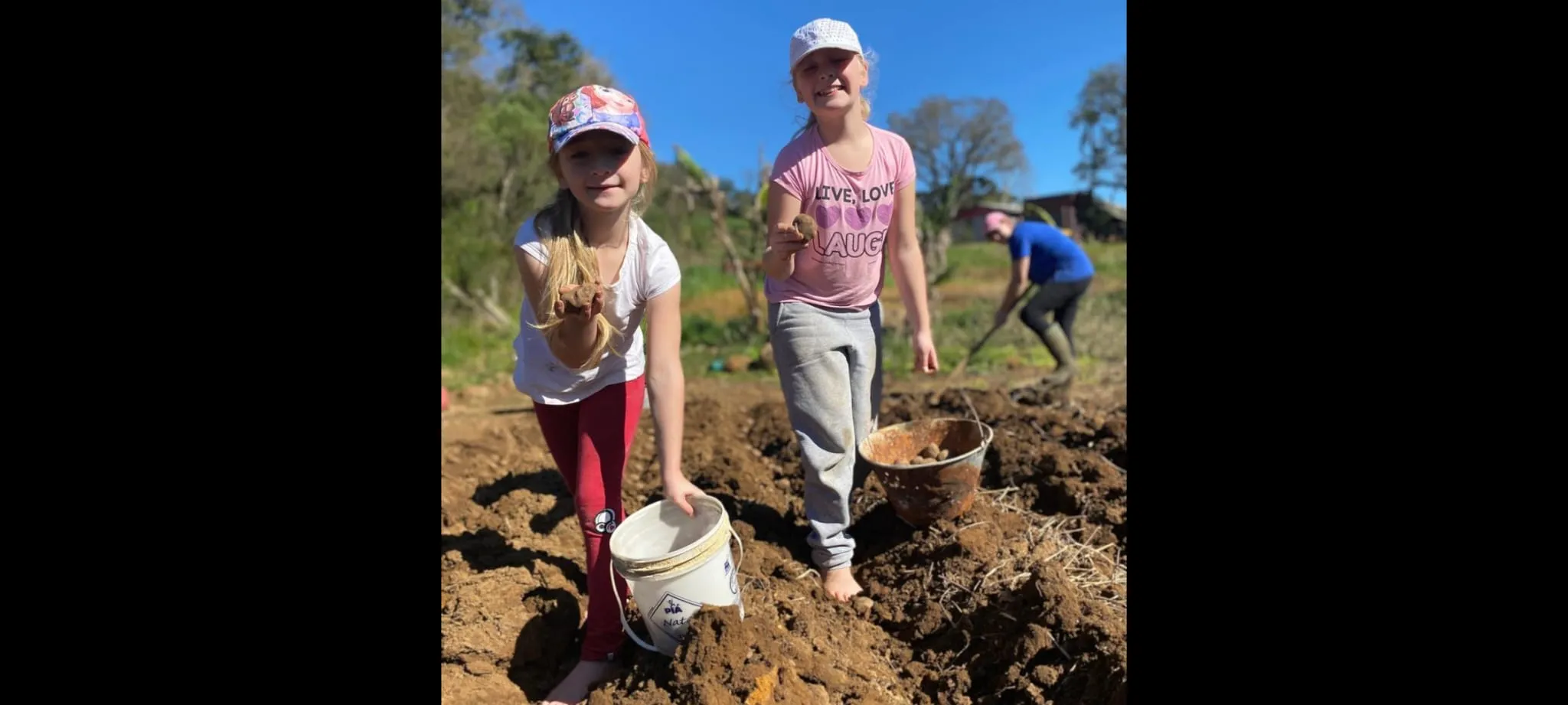 Santa Maria do Herval | Mãos pequenas e mãos calejadas repetem o mesmo gesto de abrir o sulco, depositar e cobrir. Elena, de 9 anos, e Lívia, de 6, aprenderam cedo a acompanhar os pais, Douglas Cardoso e Danara Arnold, na rotina da roça. Quando não estão na escola, ajudam a colher ovos, tratar animais, a plantar batatas, aipim e feijão, a cuidar do que é alimento e sustento. “Aqui, o trabalho é também diversão e escola. Conseguimos ensinar para elas o valor das coisas”, contou Douglas.