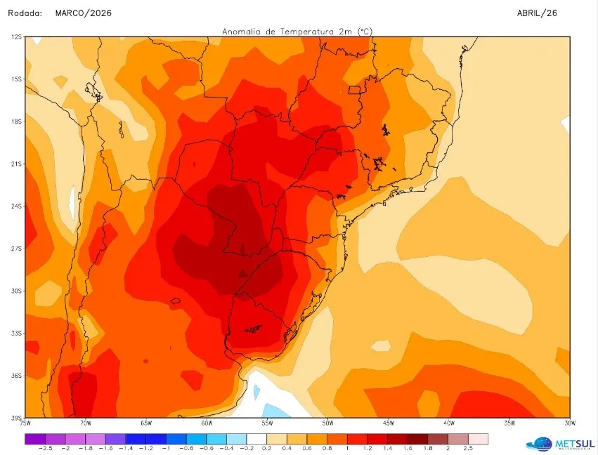 Segundo a MetSul Meteorologia, o calor intenso deve persistir por semanas, contrariando o padrão normal da estação. Os modelos de previsão do tempo indicam que o calor vai se intensificar ainda mais nos próximos dias, com máximas acima de 35ºC no Rio Grande do Sul e em áreas mais a Oeste de Santa Catarina e do Paraná. O mês de abril também deve ser mais quente do que o normal, com temperaturas acima da média na maior parte do Centro-Sul do Brasil.