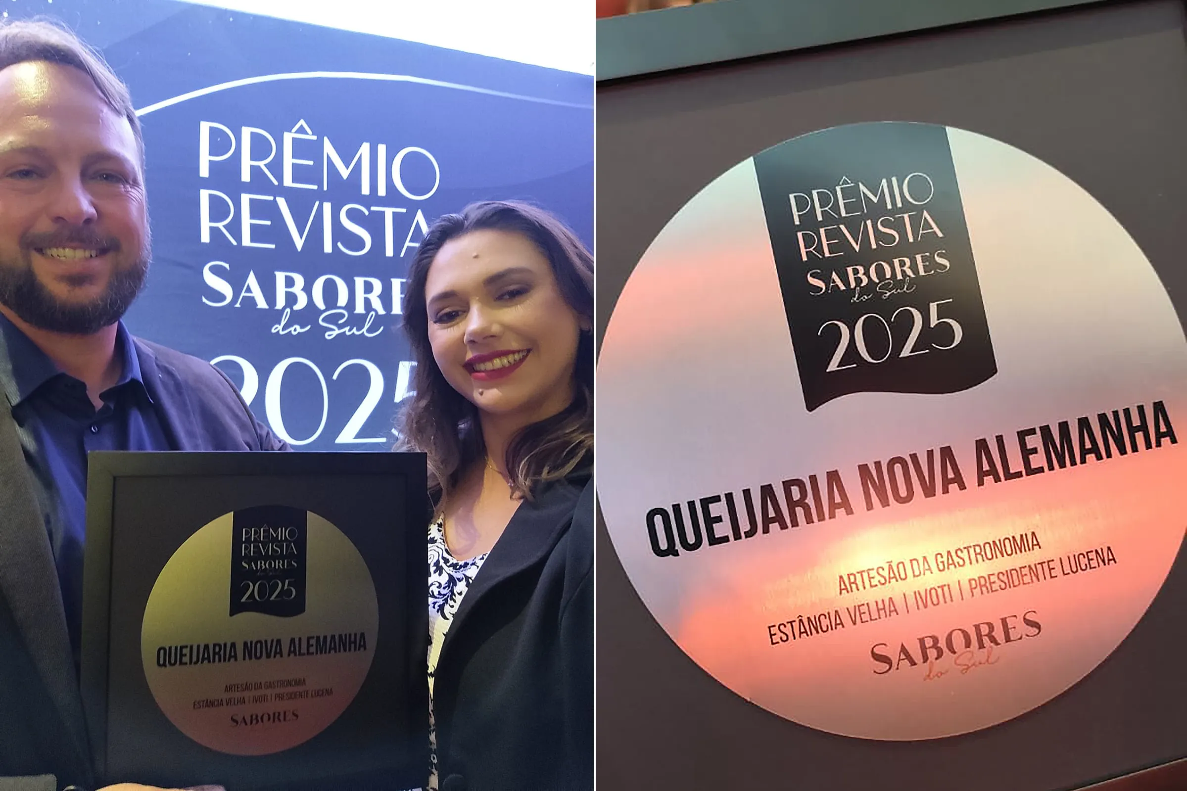 A Queijaria Nova Alemanha, localizada na Nova Vila, em Ivoti, recebeu o prêmio Revista Sabores do Sul, na categoria Artesão da Gastronomia. O evento foi realizado na segunda-feira, 24, no Grêmio Náutico União e premiou 300 empresas. Com o tema “18 anos de sabores, histórias e conquistas”, o evento consolida quase duas décadas dedicadas a valorizar os profissionais, restaurantes e marcas que fazem da mesa gaúcha um símbolo de identidade e excelência.