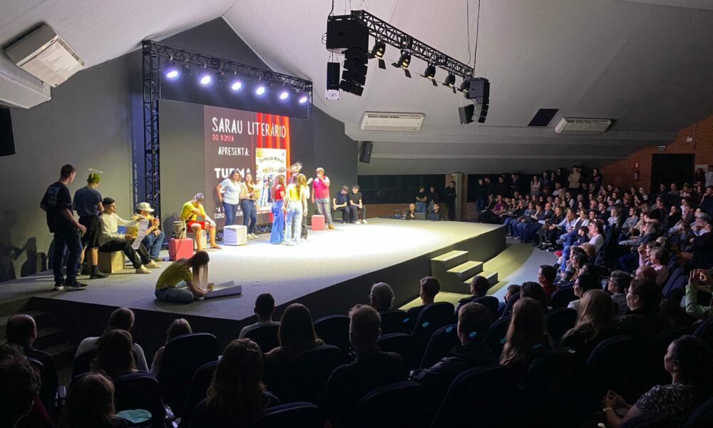 Nova Petrópolis – O 14º Sarau Literário da Escola Bom Pastor evidenciou os talentos artísticos das turmas de ensino médio. Foram dez apresentações culturais de teatro, dança e poesia que lotaram o Centro de Eventos na terça-feira, 15. Além das peças teatrais, ensaiadas desde agosto pelos estudantes, em alguns períodos dos componentes curriculares de Linguagens e Artes, com a coordenação das professoras Gracieli de Brida Sperotto, Anita Osvald Rattes e Luíse Lorenz, o Sarau do Bompa contou também com declamação de poesias tradicionalistas e exposição de trabalhos artísticos dos estudantes. Além das atrações no palco, o Sarau contou ainda com campanha solidária “Doe um Livro”, espaço temático para leitura e venda de lanches, organizada pelo GEBOP.
