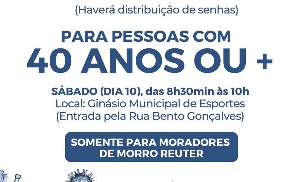 Em Morro Reuter, sábado (dia 10) é dia de 1ª dose da vacina contra Covid. O público alvo é de 40 anos ou mais. Será das 8h30min às 10h, no Ginásio Municipal de Esportes, com entrada pela Rua Bento Gonçalves.