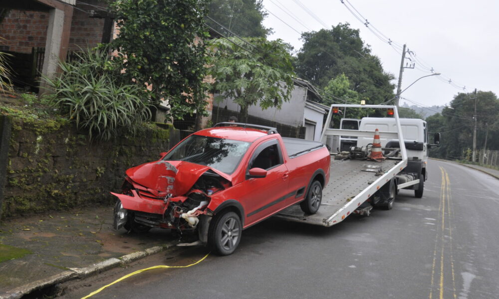 Lindolfo Collor/Hortêncio – O veículo Volkswagen Saveiro envolvido no acidente desta manhã na Av. Capivara, Vila Spindler, teve a sua frente destruída, após colidir contra um poste de concreto. O motorista é morador da localidade Campestre, São José do Hortêncio.