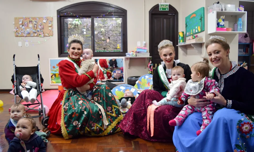 Nova Petrópolis – As cores da cultura, o brilho das tradições e a simpatia das representantes da cidade marcaram os dias 7 e 8 de julho em Nova Petrópolis. As Soberanas do Folclore Alemão, Rainha Francieli Herrmann e as Princesas Cristina Kuhn e Eduarda Baumgarten, visitaram as 21 instituições de ensino do município com um objetivo especial: divulgar o 52º Festival Internacional de Folclore e reforçar os laços entre as futuras gerações e o legado cultural da cidade.
