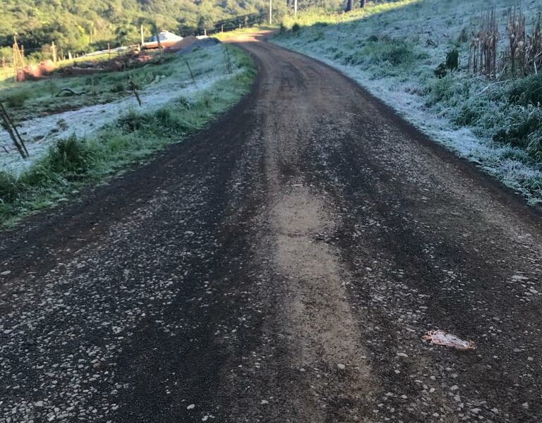 No sábado de manhã fomos surpreendidos por uma temperatura de 1 grau e por verdadeiras geleiras dos dois lados da estrada. Nos dirigimos de carro até o centro de Santa Maria do Herval e, de lá, caminhamos até Gramado cerca de 30 quilômetros morro acima. É que Herval, para quem não conhece, fica numa baixada. Na estrada era geada pra tudo que é lado. Não dava para sentar no banco para arrumar a mochila porque um tapete branco o cobria no outro lado da Sociedade. A temperatura era de 1 grau e começamos a subir em direção a Boa Vista do Herval. Caminhamos por uma hora e meia e a geada nos acompanhou durante os primeiros 7 km até que o sol derreteu o gelo. Pegamos pedaços de gelo na mão. Foi muito lindo. Acho que nunca mais vou ver coisa igual num 20 de agosto. Foi uma despedida à altura de um inverno digno do nome.