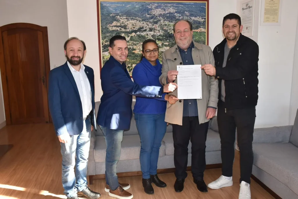 Nova Petrópolis – Uma parceria firmada entre a Prefeitura de Nova Petrópolis e a Câmara de Dirigentes Lojistas (CDL) vai viabilizar a realização da Magia do Natal 2025, que ocorrerá de 7 de novembro de 2025 a 4 de janeiro de 2026. O Termo de Fomento foi assinado nesta terça-feira, 18, pelo vice-prefeito Alexandre da Silva e pelo presidente da CDL, Marcelo de Paula Santos. Participaram ainda do momento o secretário de Turismo e Cultura, Rodrigo Barbieri Sangali; a diretora do setor de Cultura Alemã, Ana Carla Freitas da Silva; e o 2º Diretor Administrativo Financeiro, Lucas Araújo Moraes.