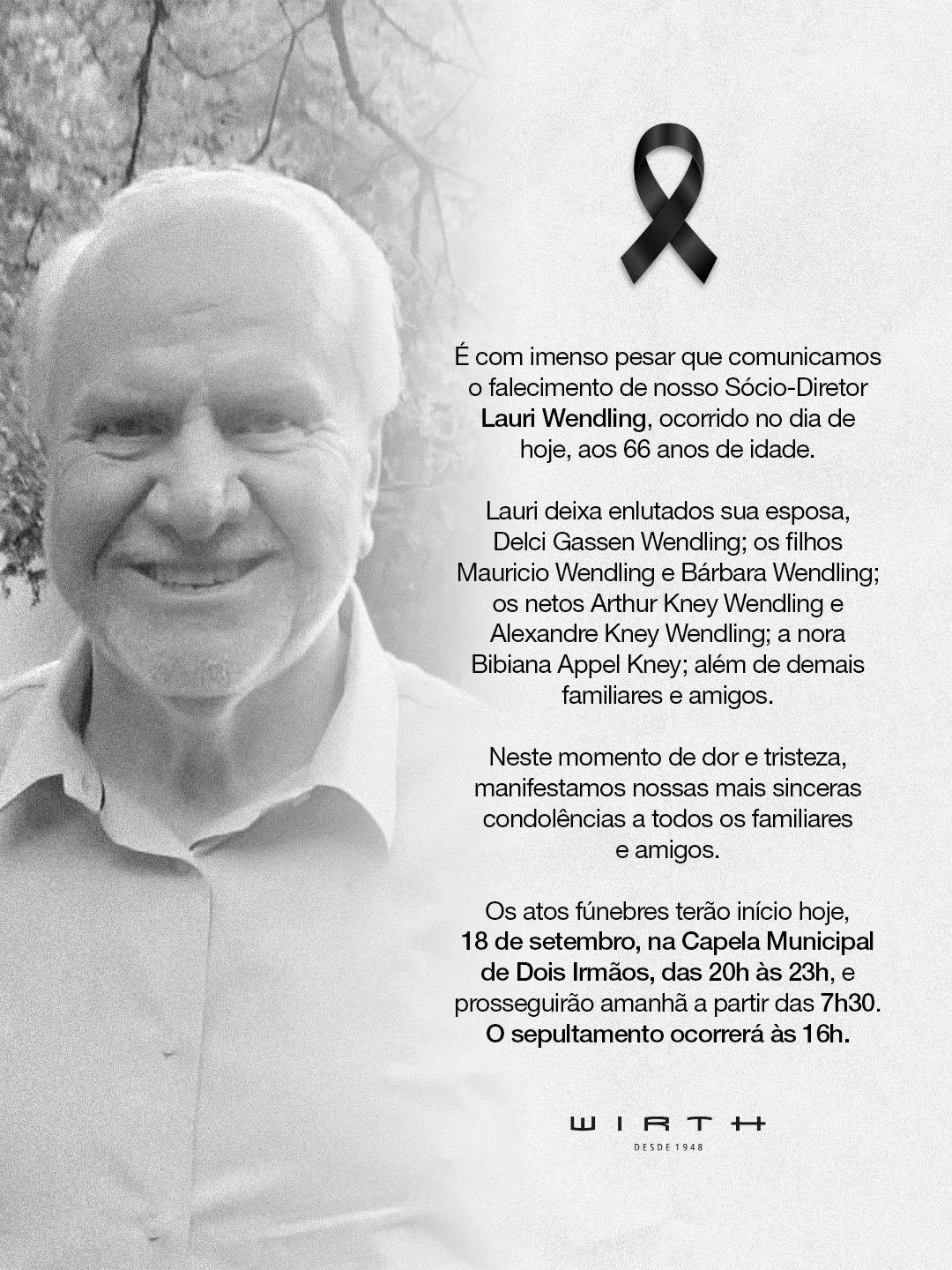 Faleceu nesta quinta-feira, dia 18, o empresário Lauri Wendling, sócio-diretor da empresa Wirth, de Dois Irmãos, aos 66 anos de idade.