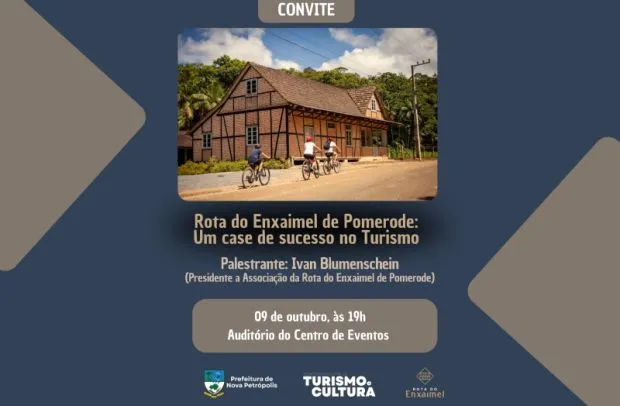 Com o objetivo de fomentar o turismo local através da valorização do patrimônio histórico, a Secretaria de Turismo e Cultura de Nova Petrópolis promove, no dia 9 de outubro, a palestra “Rota do Enxaimel de Pomerode: Um case de sucesso no turismo”. O evento, destinado ao trade turístico e à comunidade em geral, será realizado às 19h, no Auditório do Centro de Eventos.
