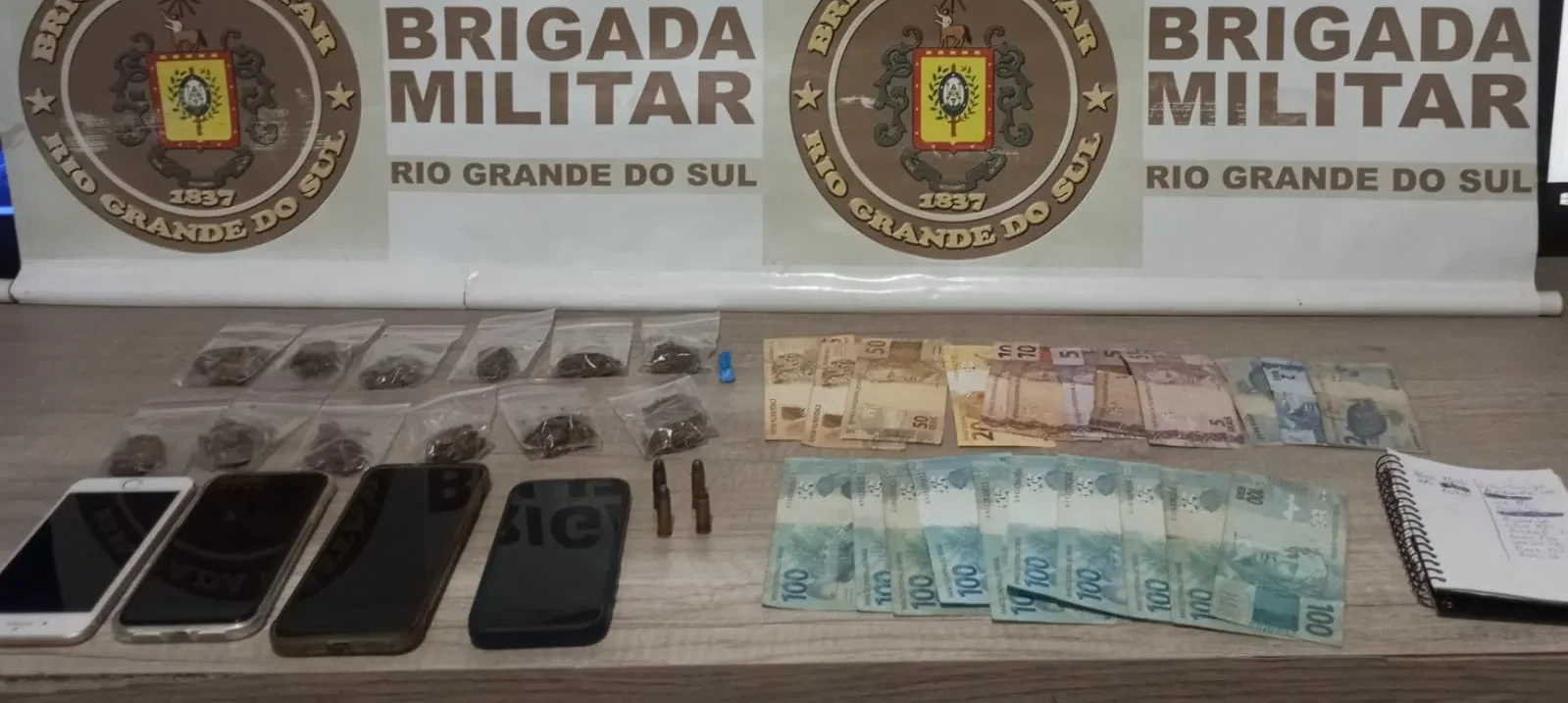 Conforme a corporação, os policiais militares realizavam patrulhamento quando abordaram o indivíduo, que tripulava uma motocicleta. Durante a identificação e a revista pessoal, foram localizadas uma porção de substância semelhante à cocaína, doze porções de substância semelhante à maconha, quatro telefones celulares, um caderno de anotações, dinheiro em notas fracionadas e quatro munições de calibre .32, sendo uma deflagrada.