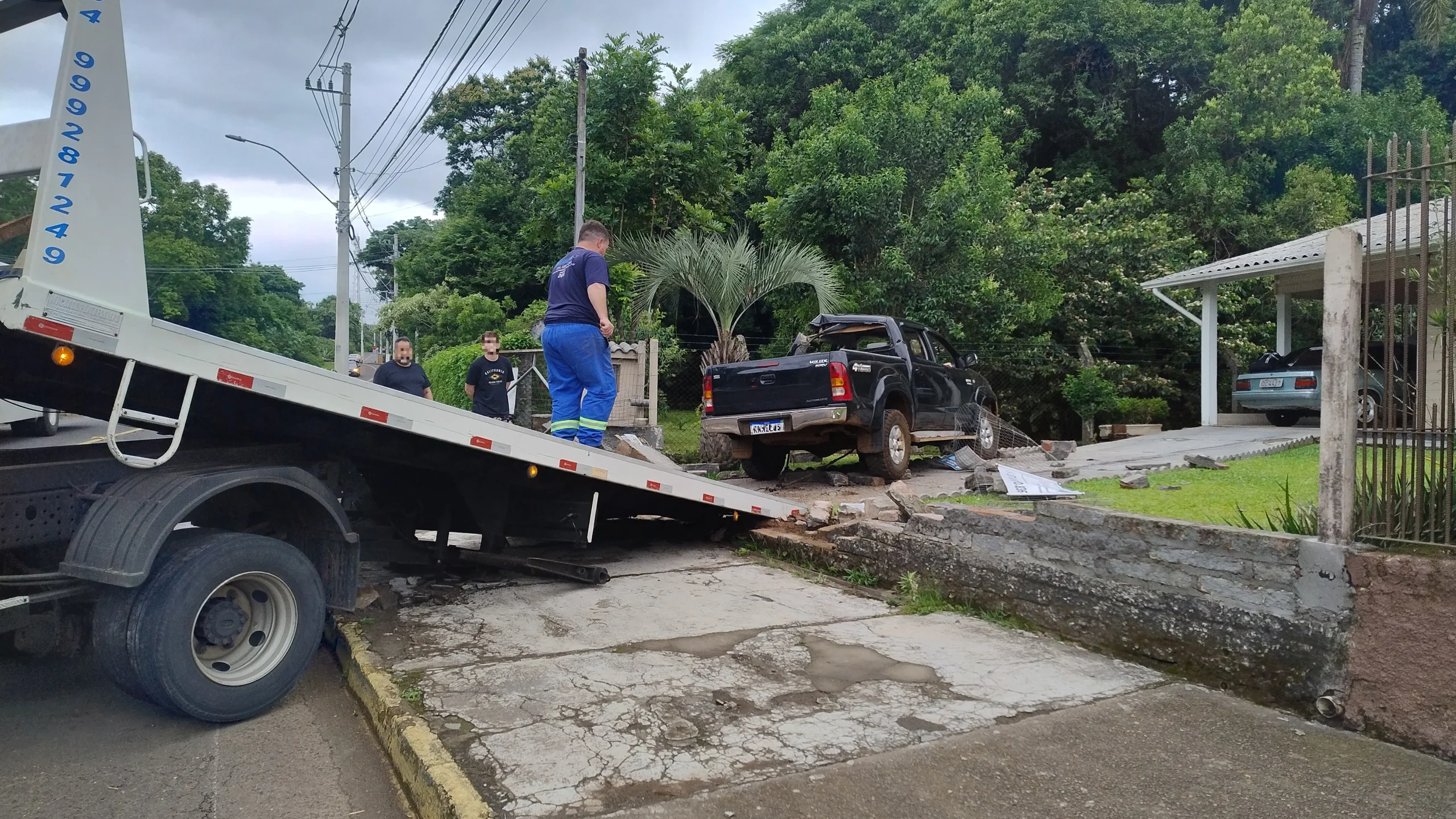 Ivoti – Na tarde desta segunda-feira (17), um guincho que seguia no sentido Ivoti/Estância Velha pela rua Castro Alves transportava três veículos quando um deles acabou caindo e invadindo o pátio de uma residência. A camioneta preta Toyota Hilux estava presa apenas pelas rodas dianteiras na parte traseira do guincho, enquanto as traseiras seguiam no asfalto. A cinta que segurava o veículo se rompeu durante o trajeto, fazendo com que o automóvel deslizasse e atingisse o muro da casa de 1561, que acabou derrubado com o impacto.