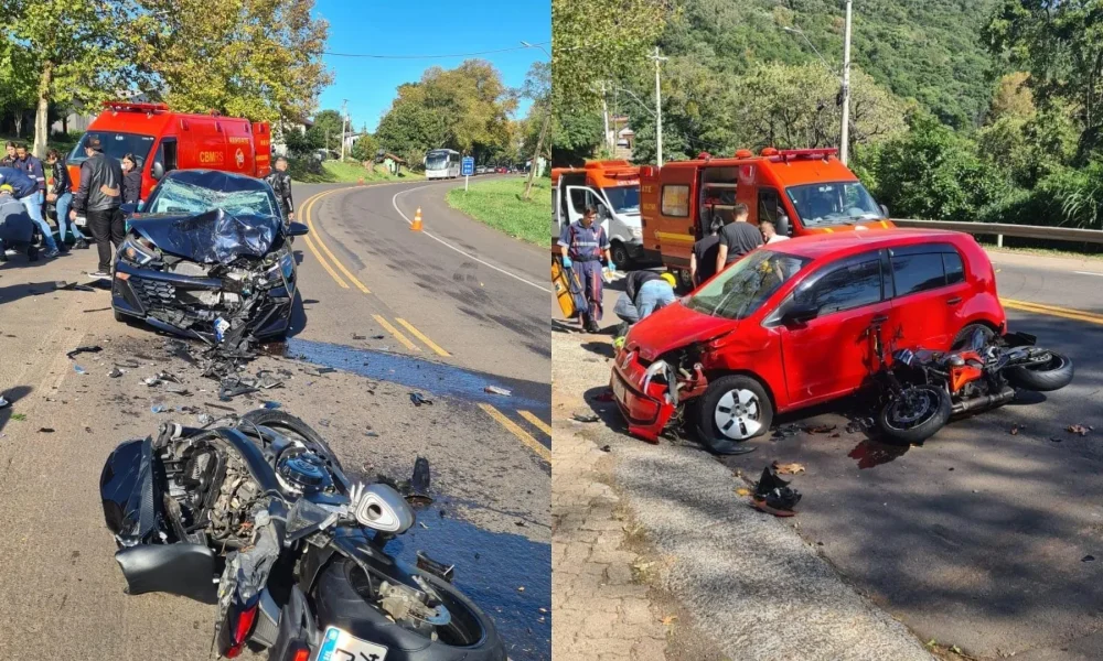 Já às 11h05, um novo acidente foi registrado no km 215,2 da mesma rodovia, próximo à conhecida curva do Morro das Antenas. A colisão, dessa vez transversal, envolveu uma motocicleta Kawasaki Z800, também com placas de São Leopoldo, e um automóvel Volkswagen UP de Lajeado. O motociclista, de 25 anos, teve fratura no pulso, além de dores no tornozelo e nas costelas do lado esquerdo. A caroneira da moto apresentava sintomas de náusea, sonolência, dor lombar e ferimentos na mão esquerda. Ambos foram conduzidos conscientes e com lesões aparentemente leves para atendimento médico. O motorista do UP não se feriu.