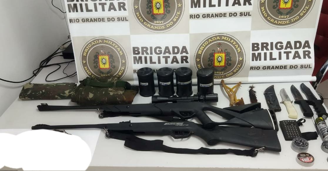 Os policias chegaram no local, visualizaram e abordaram os indivíduos, que portavam armas de pressão, munições 5.5 milímetros (chumbo), facas, algumas aves abatidas, kits de caça, pesca e sobrevivência.