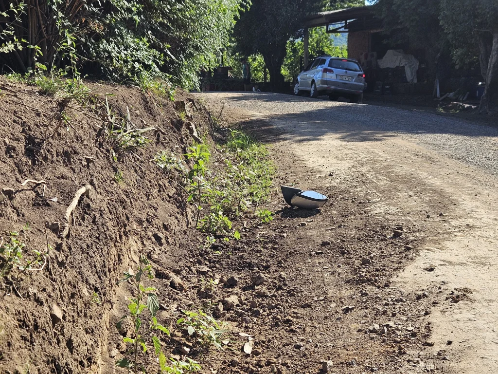 Na sequência, o motorista, que conduzia um Toyota Etios cinza, seguiu em direção ao Sítio Guamirim, na mesma localidade, onde reside seu próprio irmão. Ele quebrou o portão de acesso e colidiu contra a estrutura da residência, causando perda total do veículo.
