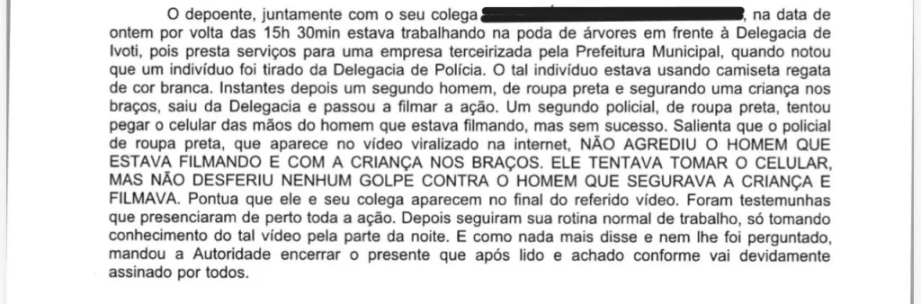 O segundo servidor, identificado pelas iniciais J.B.C.F., também funcionário da empresa terceirizada que presta serviços à Prefeitura de Ivoti, confirmou a versão apresentada pelo colega. Em seu depoimento, relatou que presenciou o mesmo cenário e reforçou que, em nenhum momento, o policial agrediu o homem que segurava a criança. Segundo ele, a tentativa foi exclusivamente de tomar o celular.