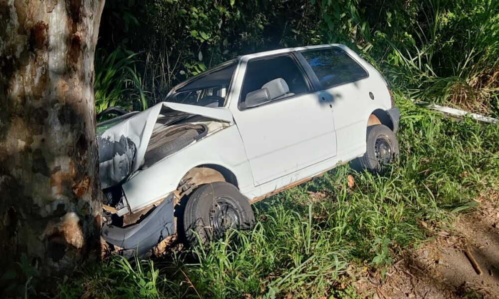 O condutor acertou uma placa e em seguida uma árvore, onde parou. A frente ficou destruída.