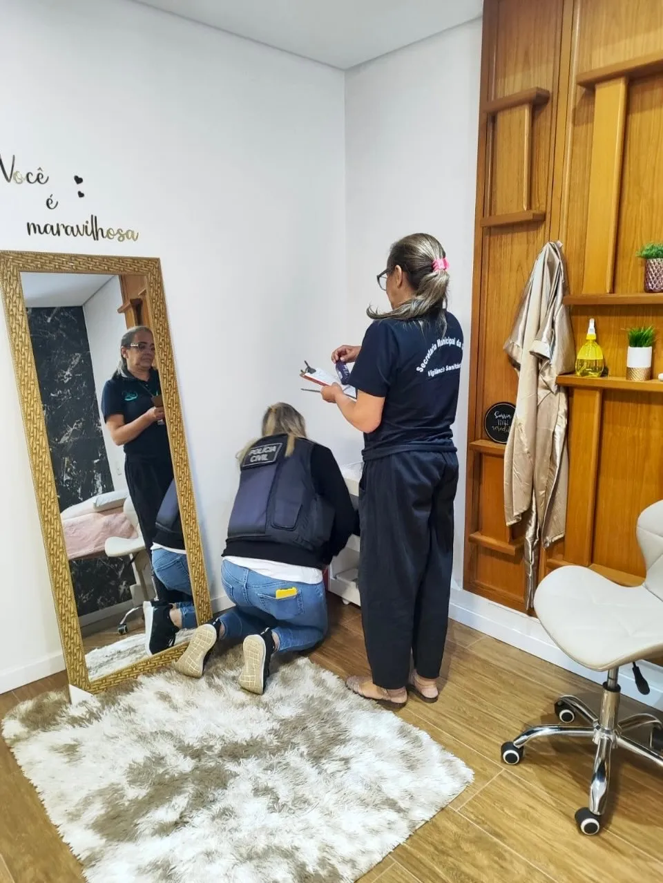 Segundo a investigação, o local seria utilizado para procedimentos estéticos irregulares, incluindo bronzeamento artificial com equipamento proibido no país. Ao chegarem à residência, os agentes localizaram, em uma sala nos fundos, uma cabine de bronzeamento vertical equipada com lâmpadas de radiação ultravioleta, além de produtos diversos relacionados às práticas estéticas. Também foram encontradas seringas com aspecto de uso recente descartadas de forma inadequada em um cesto de lixo doméstico.