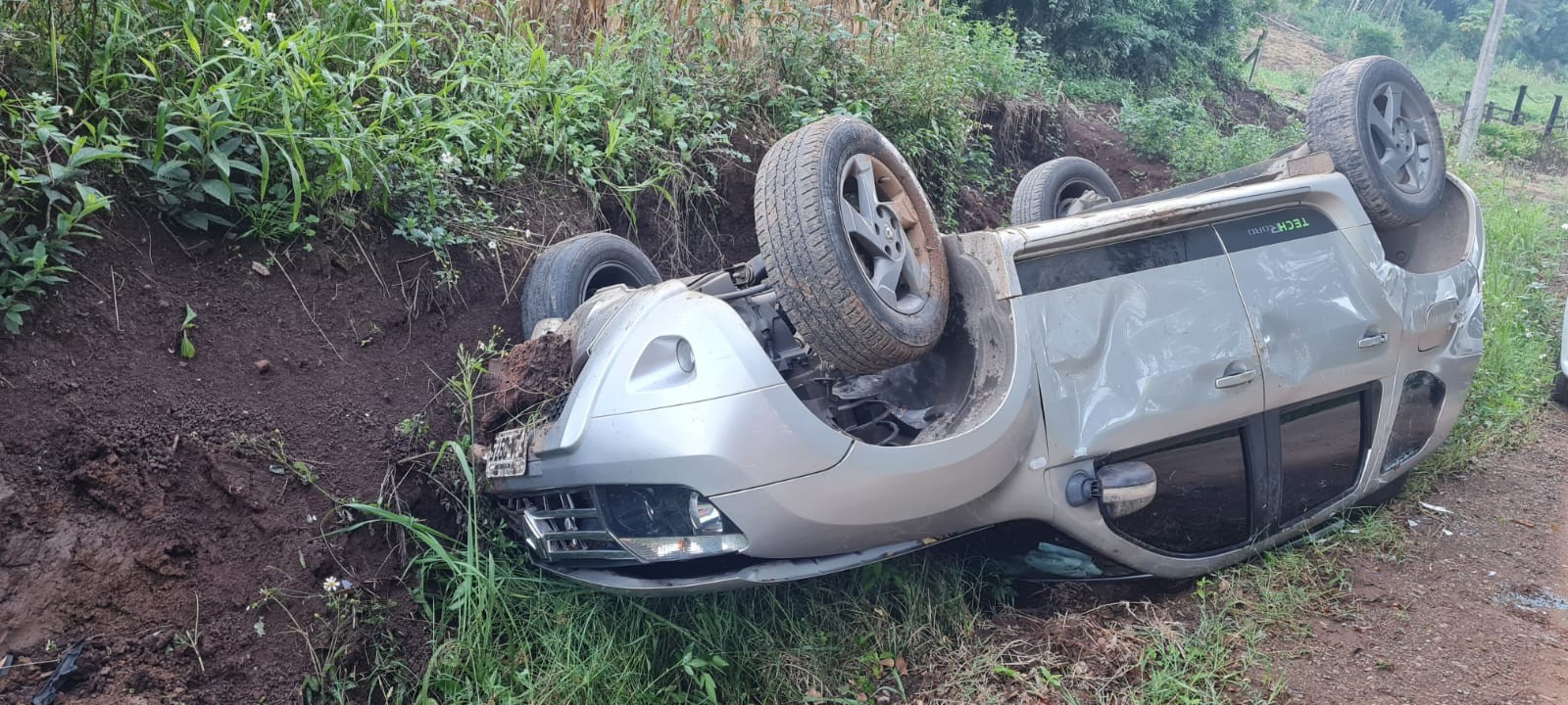 Mulher sai ilesa após capotar carro em Dois Irmãos