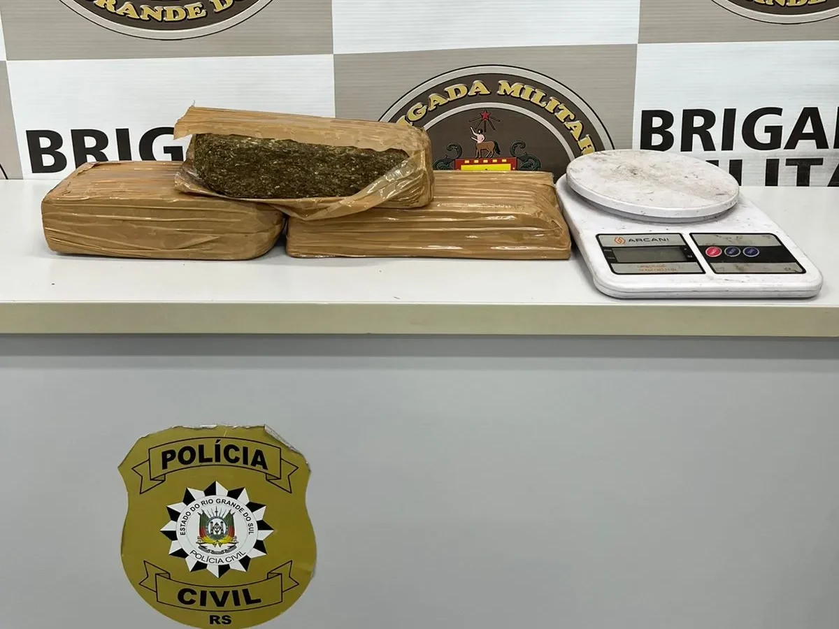 Os policiais verificavam uma ocorrência de ameaça quando abordaram o indivíduo em via pública, em frente a uma residência. Durante a revista, foram encontrados três tijolos de maconha e uma balança de precisão, totalizando aproximadamente 1,5 quilo do entorpecente.