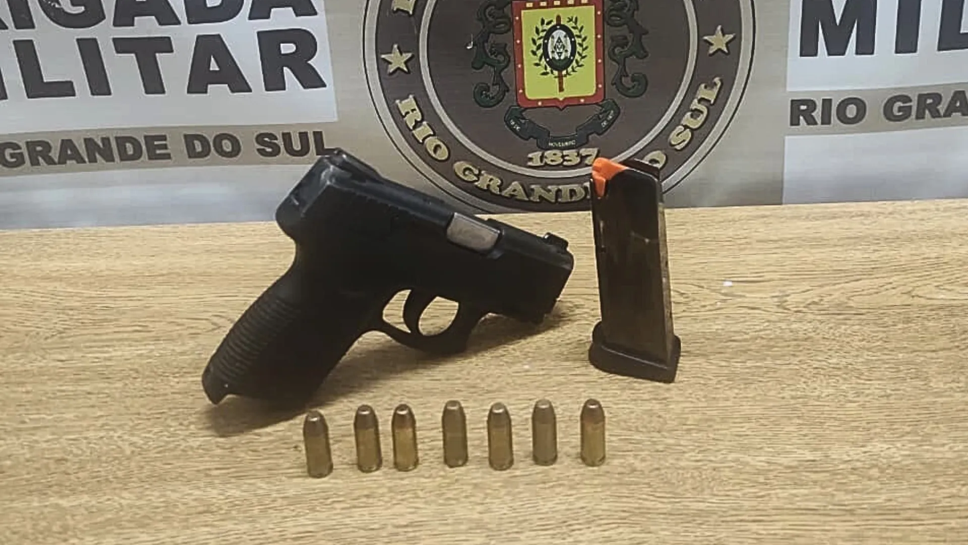 Durante as buscas, um veículo com as mesmas características foi visto dispensando uma arma de fogo no pátio de uma residência. Em contato com o proprietário do imóvel, os policiais localizaram uma pistola calibre .40, com sete munições, que possuía registro de furto na cidade de Osório.