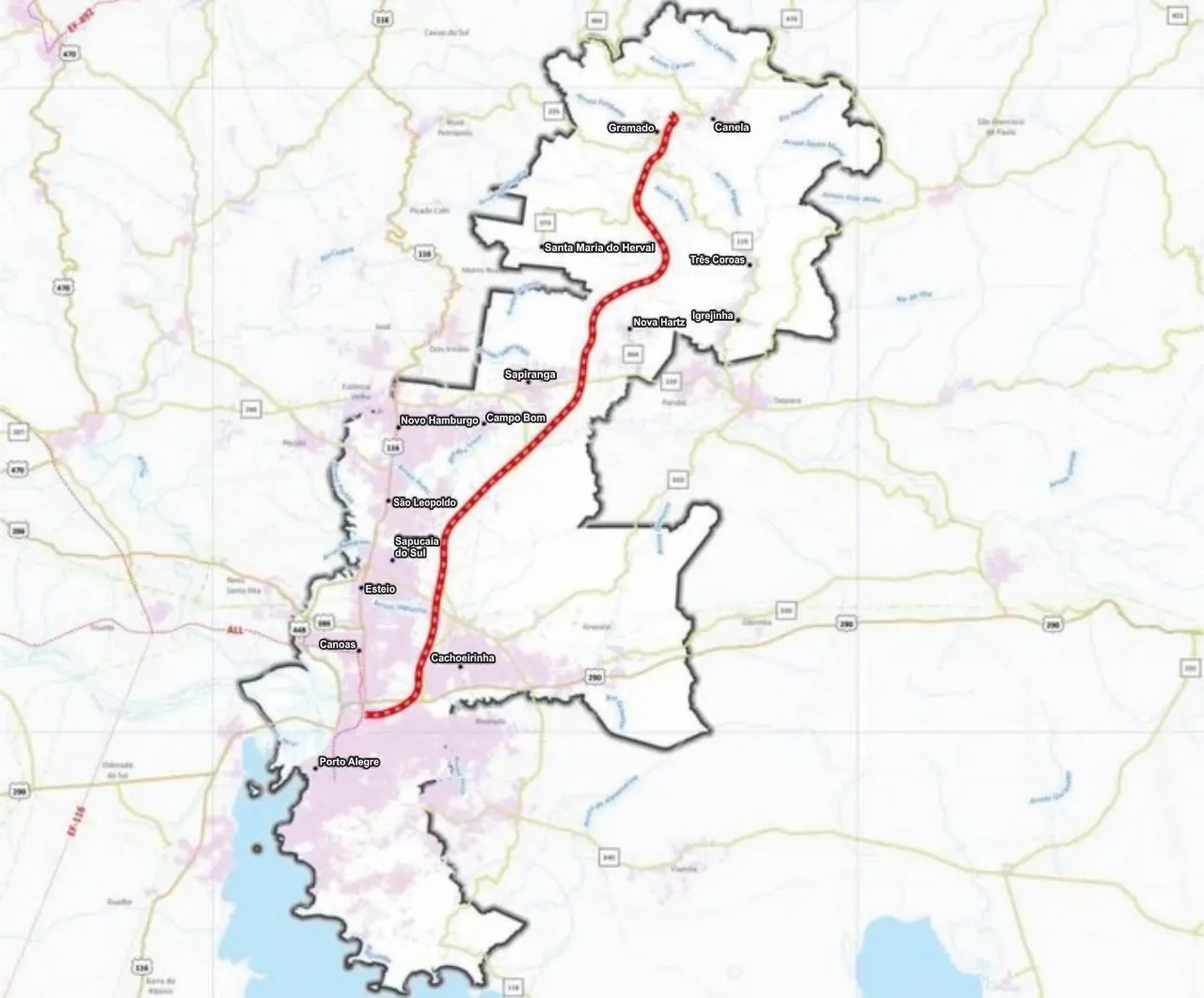Municípios do traçado e da área de influência (lista divulgada pelo governo): Porto Alegre, Canoas, Cachoeirinha, Gravataí, Esteio, Sapucaia do Sul, São Leopoldo, Novo Hamburgo, Campo Bom, Dois Irmãos, Sapiranga, Araricá, Parobé, Taquara, Morro Reuter, Nova Hartz, Igrejinha, Picada Café, Santa Maria do Herval, Três Coroas, Gramado e Canela.