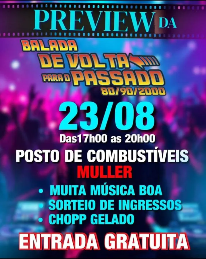 Ivoti – A contagem regressiva para a Balada de Volta para o Passado 80/90/2000 já começou! Neste sábado, 23, das 17h às 20h, o Posto de Combustíveis Muller, localizado na Avenida Presidente Lucena, 1525, em Ivoti, vai se transformar em palco de muita música boa e diversão para toda a comunidade.