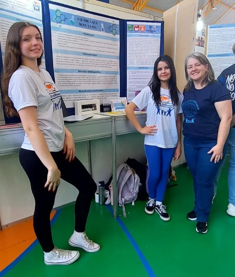 Representando a categoria 7º ao 9º ano do Ensino Fundamental, a Escola Municipal Otto Hoffmann participou com o projeto “Química que move a Vida”, apresentado pelas estudantes Caroline Hartke e Helena Auler Witt. A iniciativa teve orientação da professora Fernanda Trierweiler e apoio da supervisora Nívia Vieira.