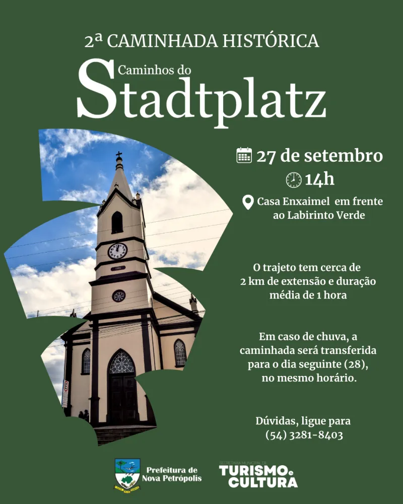 Nova Petrópolis promove no próximo sábado, 27 de setembro, a 2ª Caminhada Histórica do Roteiro Caminhos do Stadtplatz, atividade que convida moradores e visitantes a explorarem a história local em um percurso guiado pela área central do município.