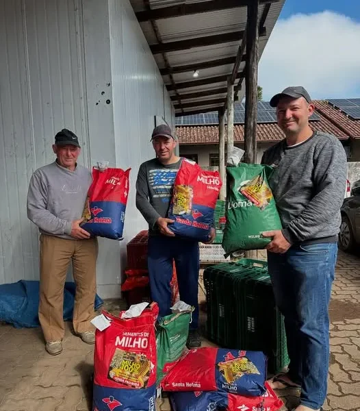 Morro Reuter – Estão sendo entregues os pedidos do Programa Extraordinário de Recuperação das Lavouras de Milho e Sorgo – Programa Milho 100% para o ano-safra 2025/2026 para produtores com enquadramento no Cadastro da Agricultura Familiar. Em Morro Reuter, 33 produtores rurais estão retirando os sacos na Emater. Nesta sexta-feira, Roque José Schons foi para a retirada com os filhos Airton José e Renato. O programa é do Governo do Estado, por meio da Secretaria de Desenvolvimento Rural (SDR).