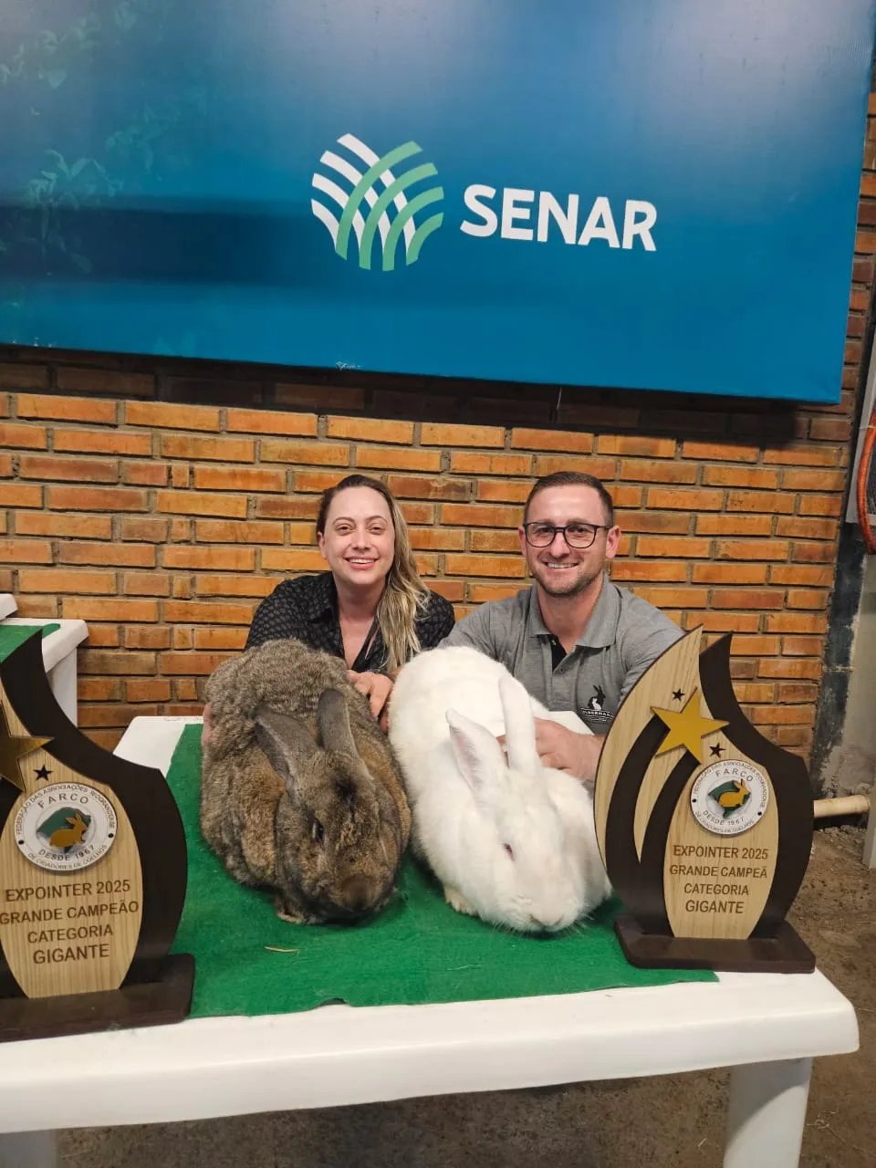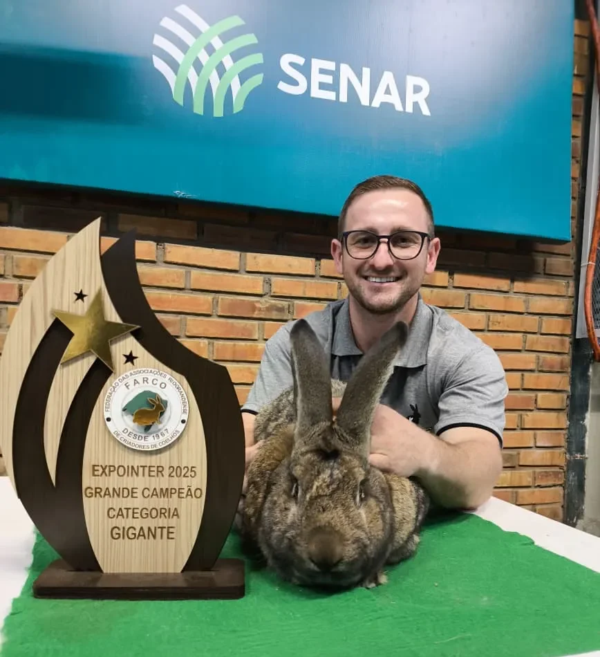 Na sexta-feira (29), Patrick já havia garantido dois troféus de primeiro lugar, com um macho e uma fêmea da raça Flandres. E na manhã deste domingo (31), veio a notícia que emocionou ainda mais a família: o criatório também venceu o prêmio de Coelho Destaque, com o macho campeão.