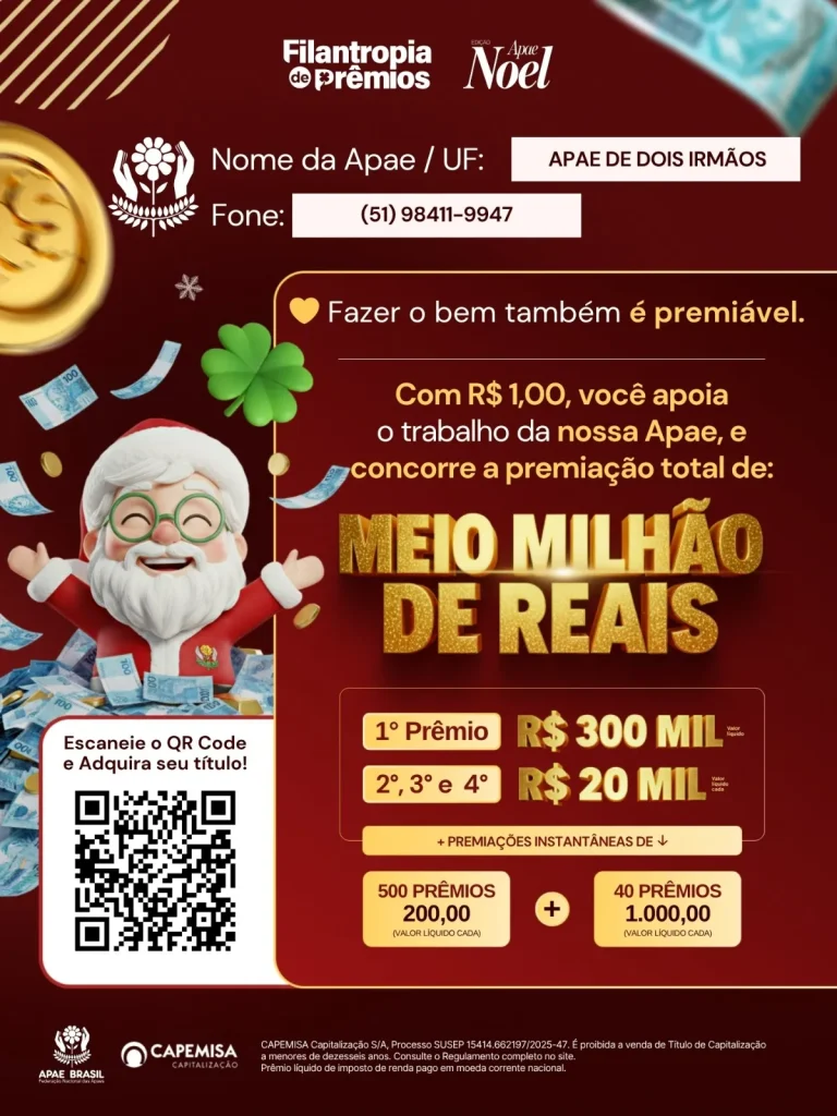 Com apenas R$ 1,00, você apoia o trabalho da APAE de Dois Irmãos e ainda concorre a até meio milhão de reais em prêmios!