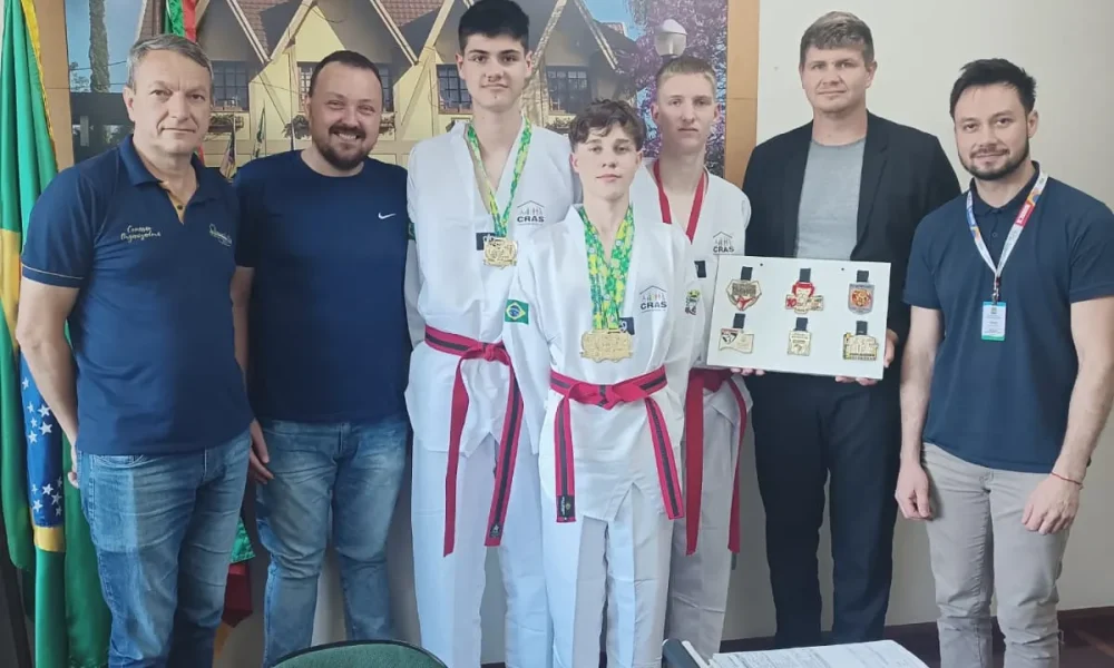 Presidente Lucena – O prefeito Luiz Spaniol recebeu em seu gabinete, nesta semana, os jovens atletas que representaram o município na 17ª edição da Copa América de Taekwondo, realizada em Arujá, São Paulo. O encontro contou com a presença do vice-prefeito e coordenador do CRAS, Joel Metz, e do diretor de Assistência Social, Tiago Frohlich, que parabenizaram os alunos pelo excelente desempenho na competição nacional.
