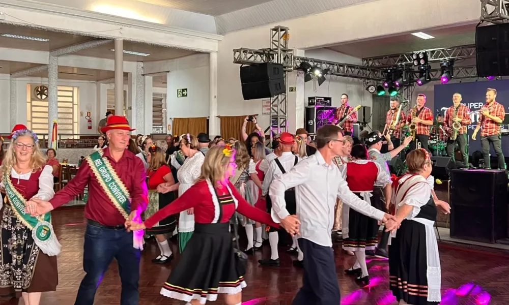 Dois Irmãos-A tarde desta sexta-feira (26) é marcada por muita alegria e integração no Baile da Terceira Idade, realizado na Sociedade Santa Cecília. O evento conta com a presença da corte do Kerb, que, ao lado do prefeito Jerri Meneghetti, abriu oficialmente a festa ao som da Banda Real.