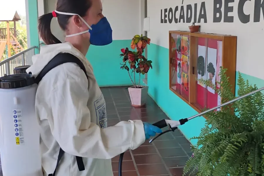 São José do Hortêncio – Nos dias 19 e 20 de novembro, a agente de combate às endemias, Julisse Auler, e o servidor Vilmar dos Santos realizaram o procedimento de borrifação (BRI Aedes) em prédios públicos, escolas, igrejas e demais locais com grande circulação de pessoas. A ação integra as medidas preventivas adotadas pelo município para reduzir o risco de infestação do Aedes aegypti, mosquito transmissor da dengue, zika e chikungunya.