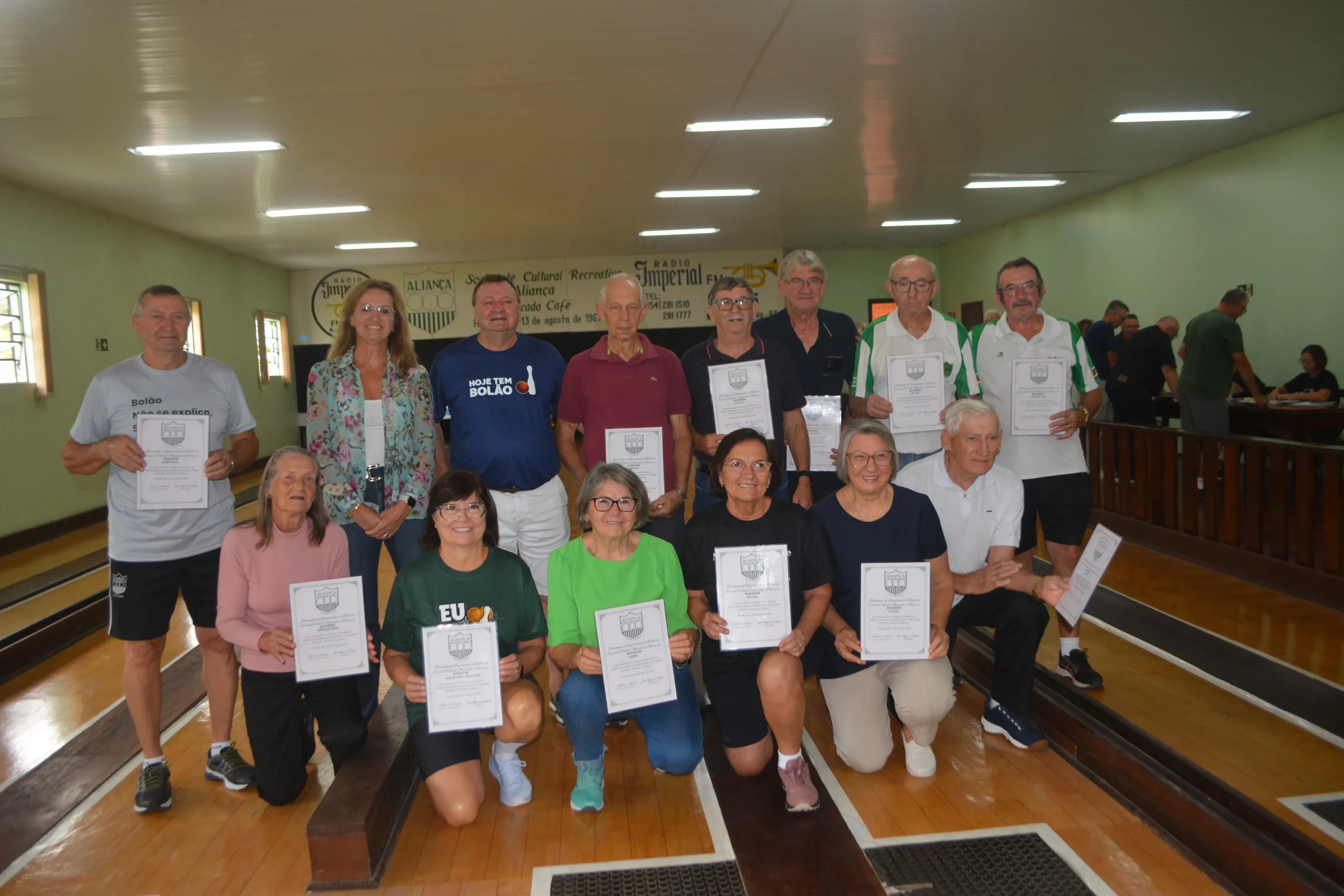 Picada Café – Agradecer a quem fez história num dos clubes mais antigos e porque não, na cidade. Foi assim na manhã de domingo, 12, quando a Sociedade Aliança fez uma homenagem especial aos homens e mulheres que em 2017 colocaram o nome do clube e da cidade no seleto grupo de campeões do Campeonato Brasileiro de Bolão da Melhor Idade. E o inédito título veio no masculino e feminino, jogando em casa. Um a um os campeões receberam um diploma em forma de agradecimento e gratidão. Em um dos momentos mais marcantes a viúva do capitão da equipe, Remídio Kintschner, dona Sibila Kintschner, recebeu a homenagem. Remídio faleceu anos após dar o inédito título a Sociedade Aliança. O presidente João Ricardo Schaab, o “Tampinha”, explica a importância do título de campeão brasileiro. “O que essas pessoas fizeram foi algo que foi eternizado. Os títulos que esses homens e mulheres foi, é e sempre será um orgulho para o clube e seus associados”, frisou. Os títulos de 2017, afirma “Tampinha”, devem inspirar. “O bolão é um esporte coletivo que ultrapassa fronteiras. A dedicação a ele levou nossos times a esse importante título nacional”, declarou. Confira quem são os campeões brasileiros de 2017.