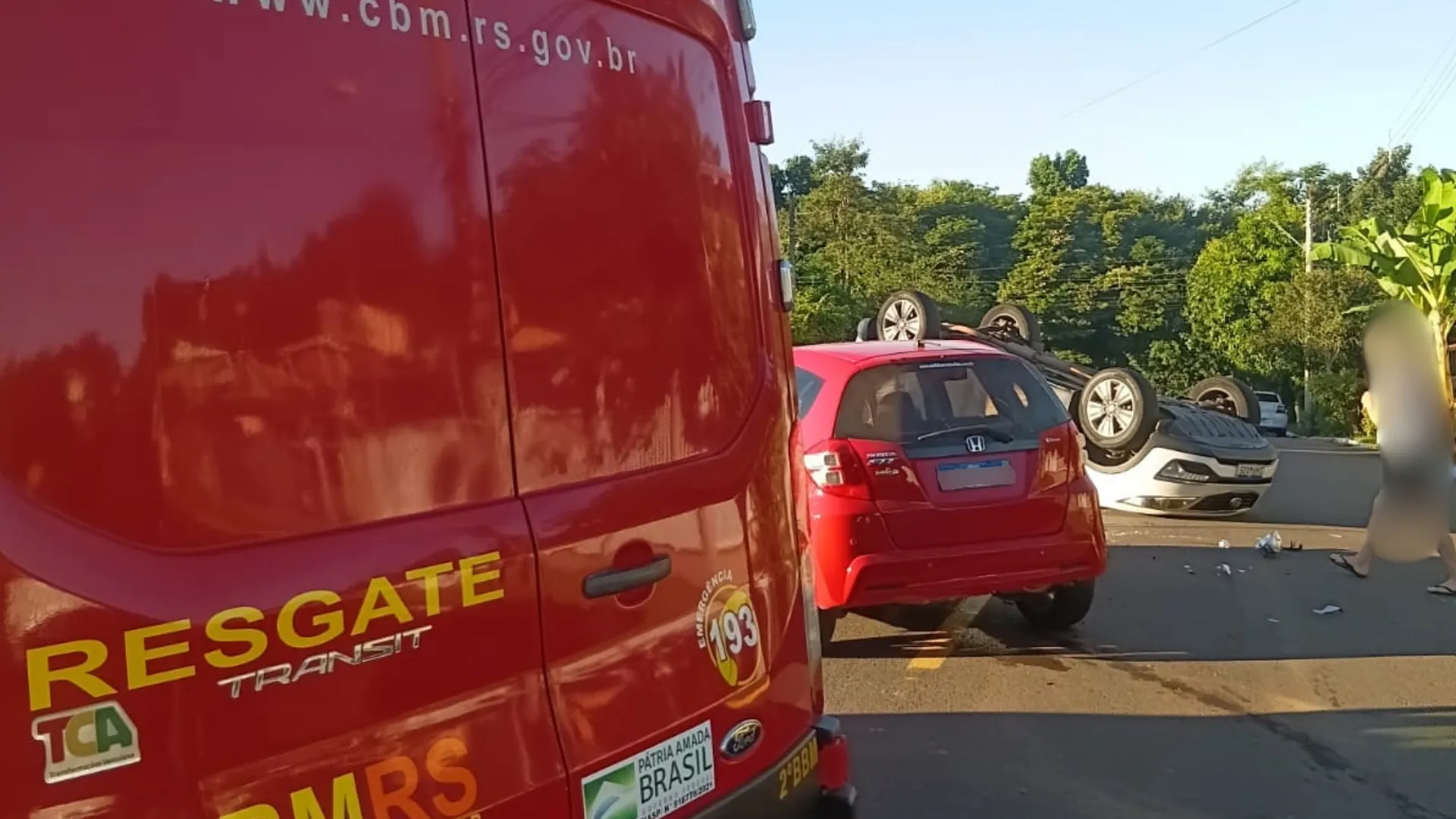 Capotamento é registrado após colisão entre veículos no bairro Cidade Nova, em Ivoti