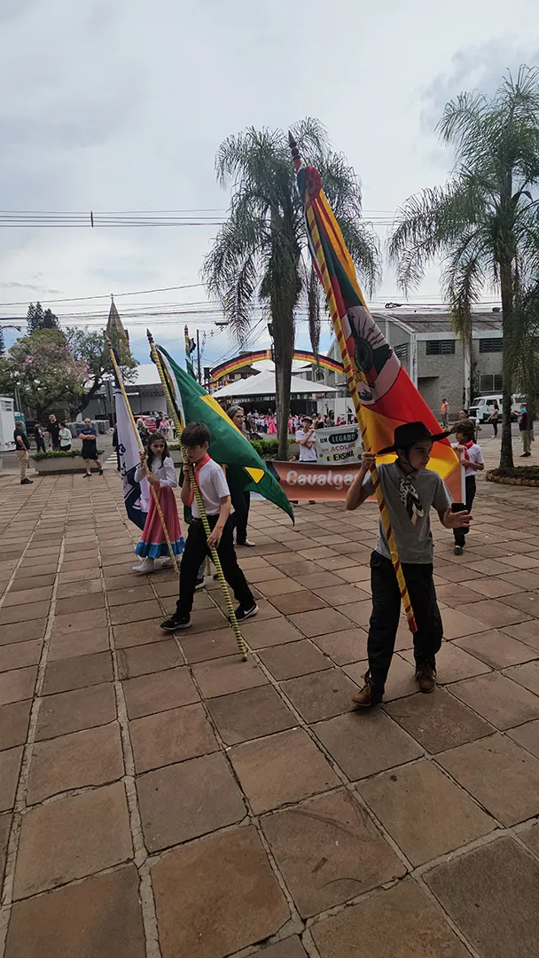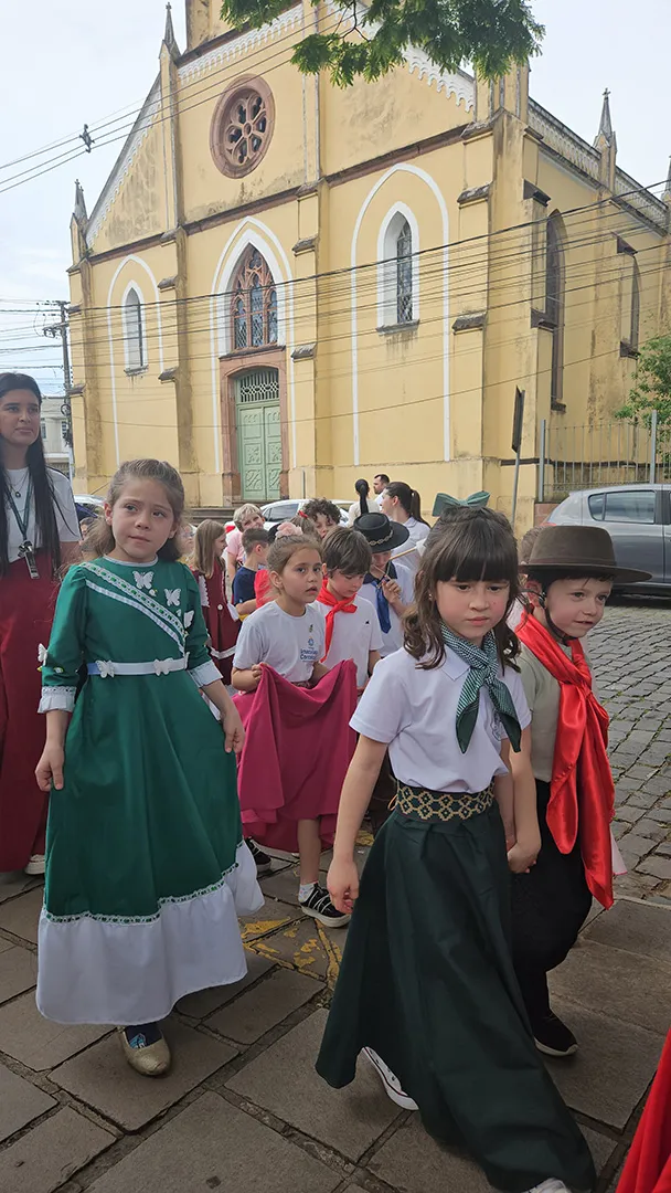 A atividade, inserida na programação da Semana Farroupilha, consistiu em uma procissão simbólica das crianças, que saíram do Colégio em direção à Igreja Matriz carregando cavalinhos de pau. No local, foram acolhidas com uma bênção especial do Padre. Além do caráter cultural e religioso, a ação trouxe também uma mensagem de responsabilidade social. Em apoio à campanha da Prefeitura, os alunos carregaram bandeirinhas com pedidos de paz no trânsito, reforçando a importância da atenção e do cuidado nas vias públicas.
