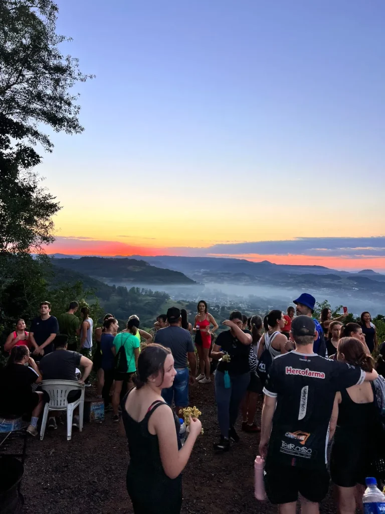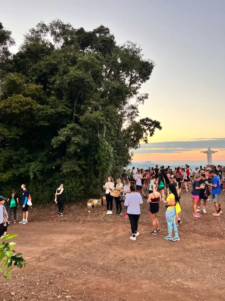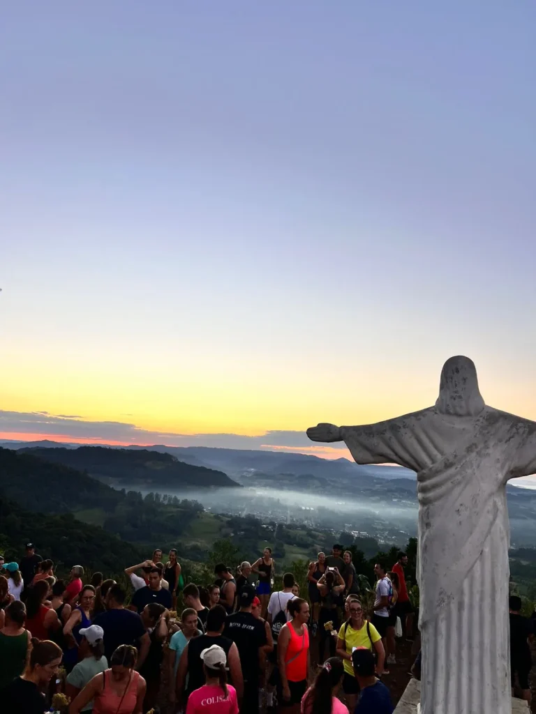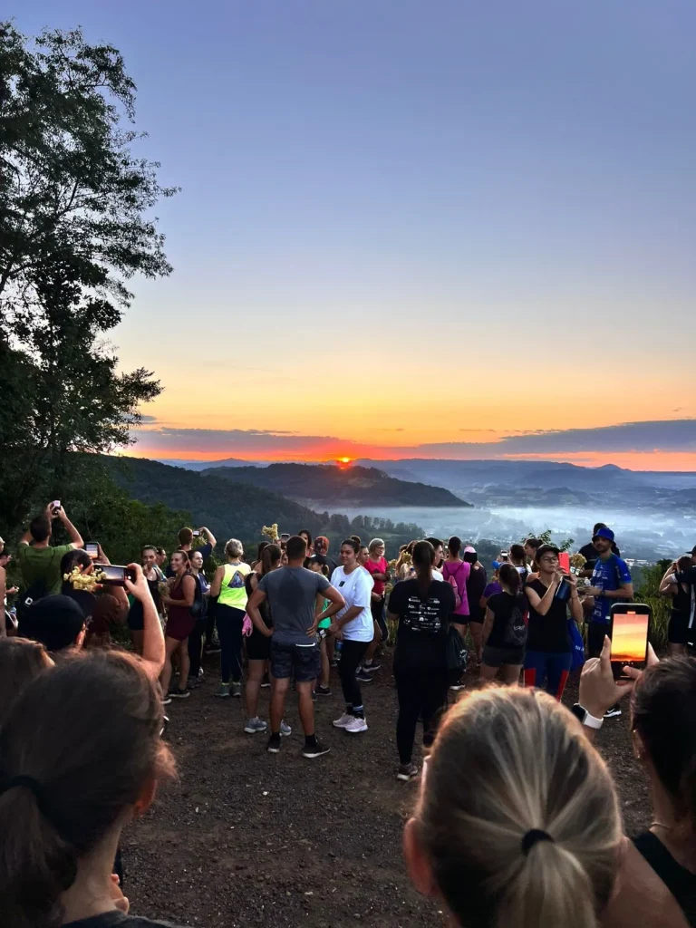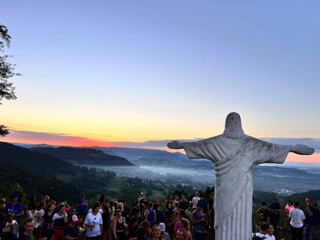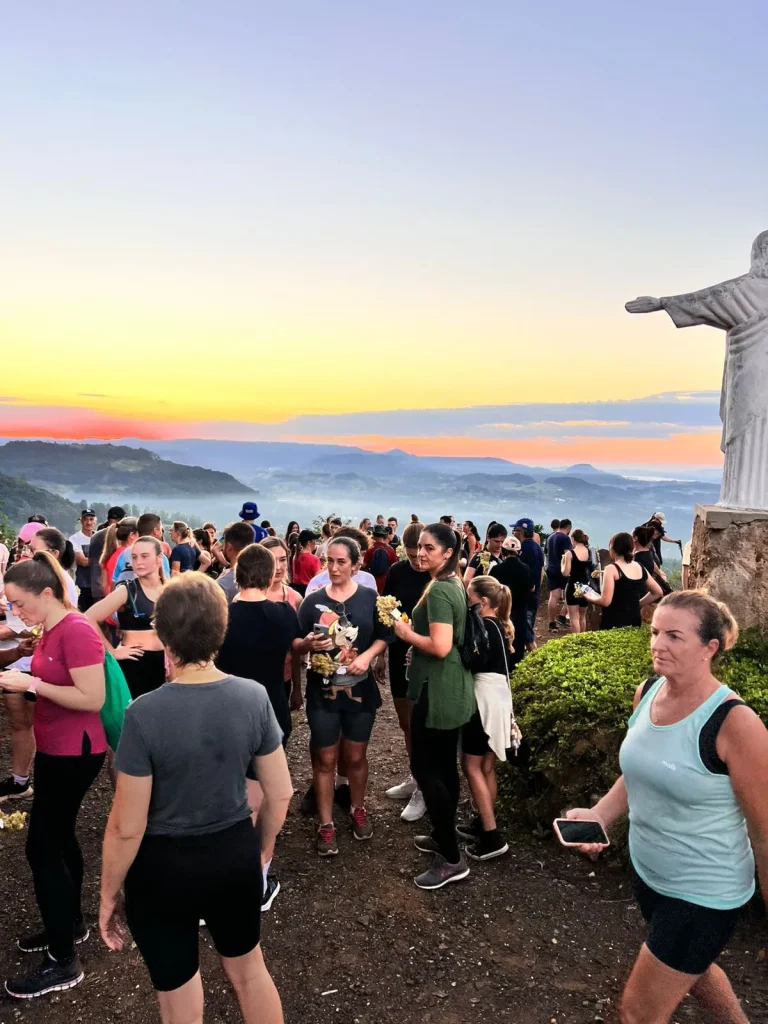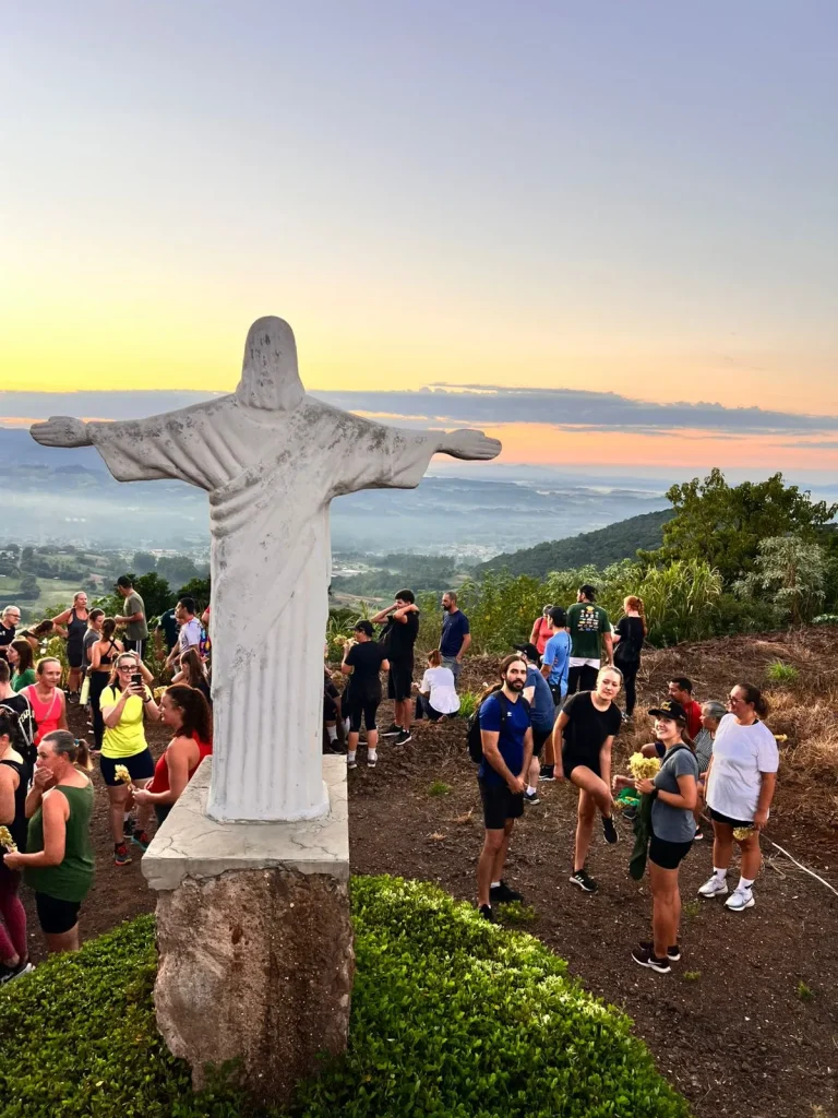 A concentração ocorreu nas primeiras horas do dia, em frente à Prefeitura, de onde os participantes seguiram pelo trajeto de aproximadamente 9 quilômetros, em meio às belas paisagens do interior do município. O ponto alto foi o amanhecer, acompanhado durante a caminhada, proporcionando um momento especial de reflexão e conexão com a natureza. No Morro do Cristo, os participantes puderam prestigiar o lindo nascer do sol, tornando a experiência ainda mais marcante.