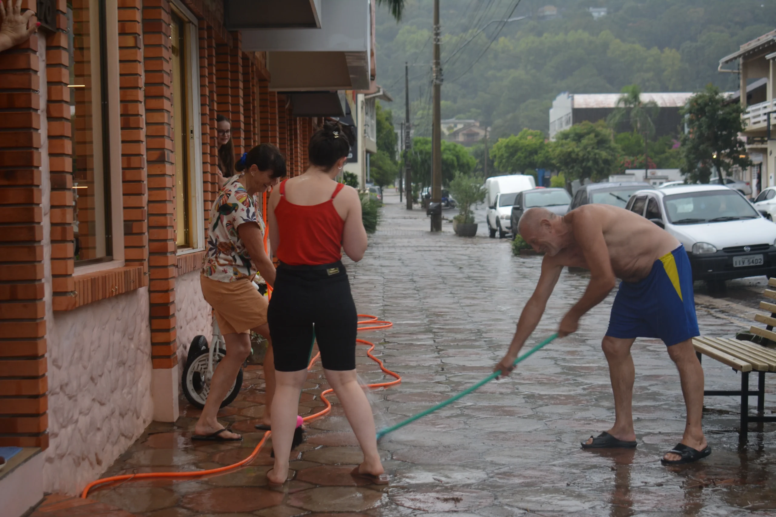 Após o escoamento da água, comerciantes precisaram limpar a frente de seus estabelecimentos CRÉD: Bruno Wingert