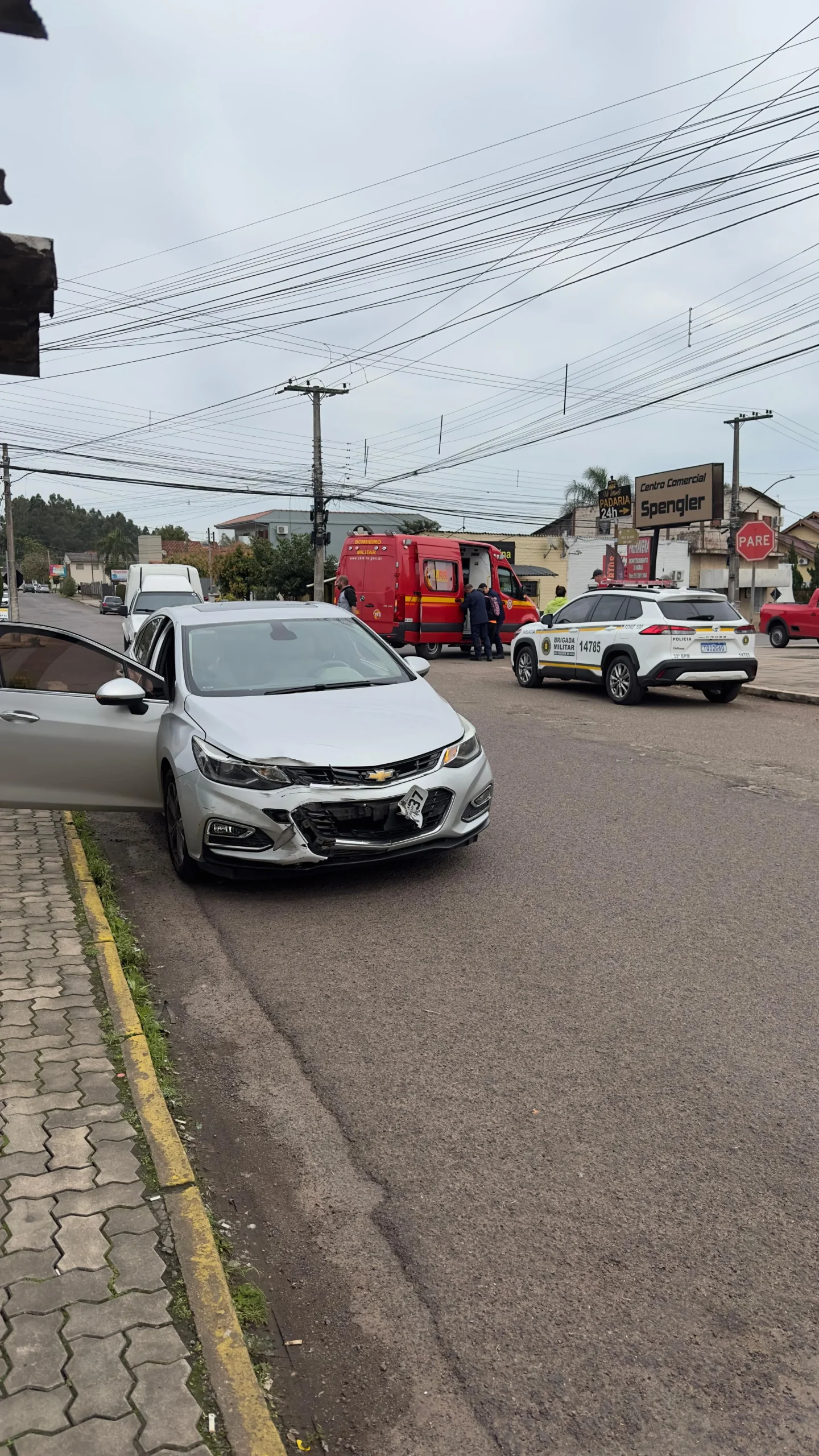 Estância Velha – Colisão entre carro e moto deixa motociclista levemente ferido na tarde desta segunda-feira (25), no cruzamento entre a Rua Portão e a Rua 13 de Maio, no bairro Lira.