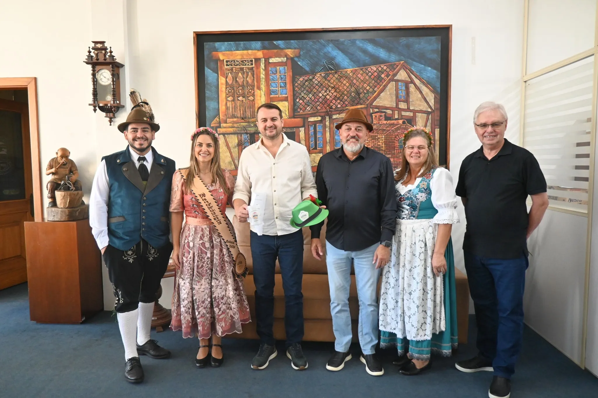 Dois Irmãos – A comitiva do 43º Festival de Kerb de Estância Velha visitou, nesta terça-feira (31/03), o prefeito, Jerri Meneghetti, e o secretário de Desenvolvimento Econômico, João Luiz Weber. O encontro teve como objetivo divulgar a programação do evento e reforçar a integração e os laços culturais entre os municípios.