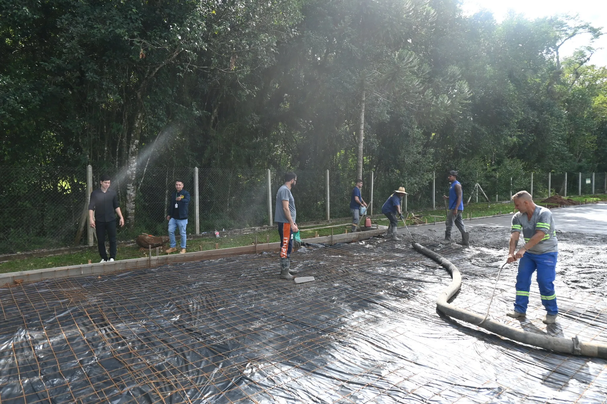 Na última quarta-feira (11/03), uma etapa importante foi concluída: a concretagem das quadras de futsal e basquete. A ação foi acompanhada pelo secretário de Desenvolvimento Social e Habitação, Ederson Arantes Bueno, e pelo engenheiro da Secretaria, Yan Dalbem Pontes.