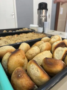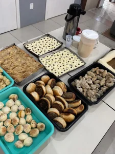 Pães e biscoitos variados como pão de mandioca crua, pão de queijo, broas de polvilho, empadinha, bolinhas e calça virada.