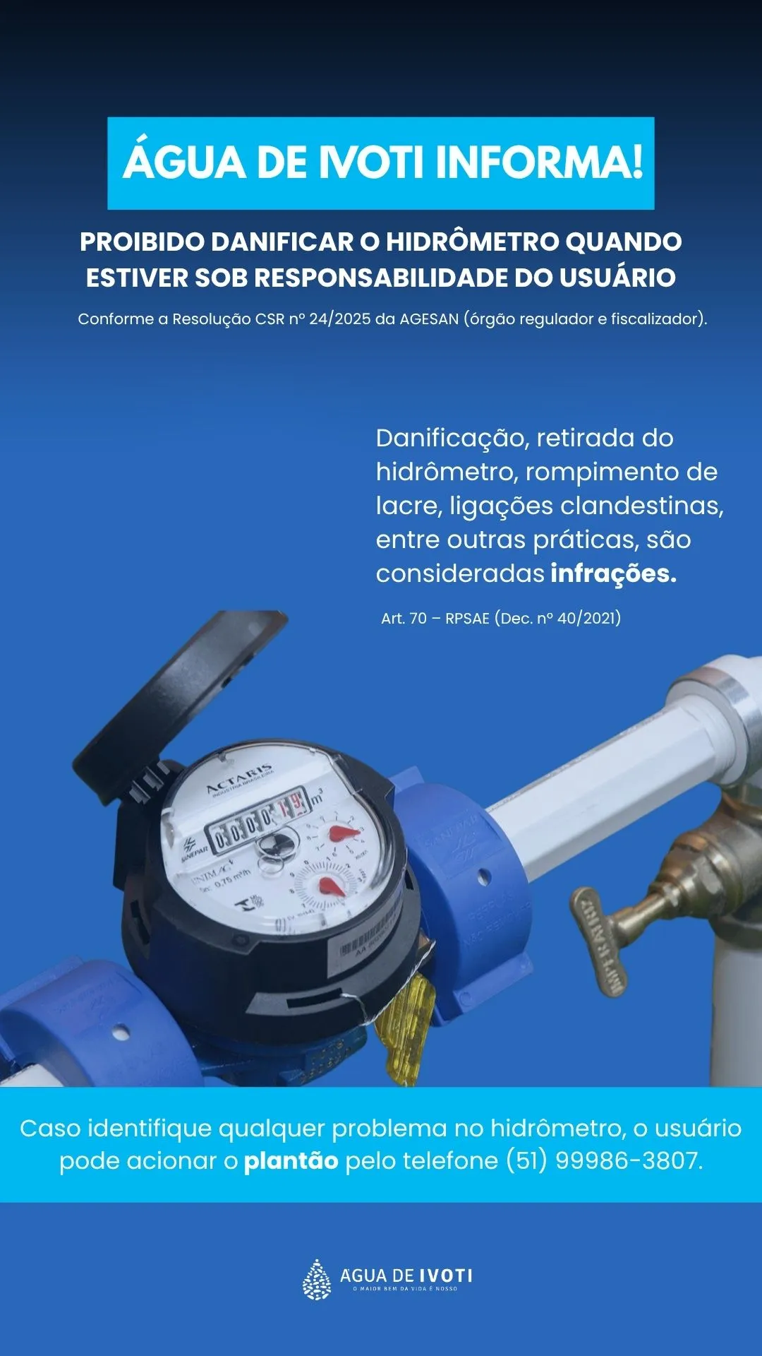 Ivoti – Você sabia que danificar o hidrômetro é proibido? Os hidrômetros e demais equipamentos instalados no momento da ligação de água são de propriedade da Água de Ivoti, portanto, os usuários não possuem o direito de realizar nenhum tipo de alteração no dispositivo. Sendo assim, é de extrema importância preservar o medidor e evitar qualquer tipo de dano.