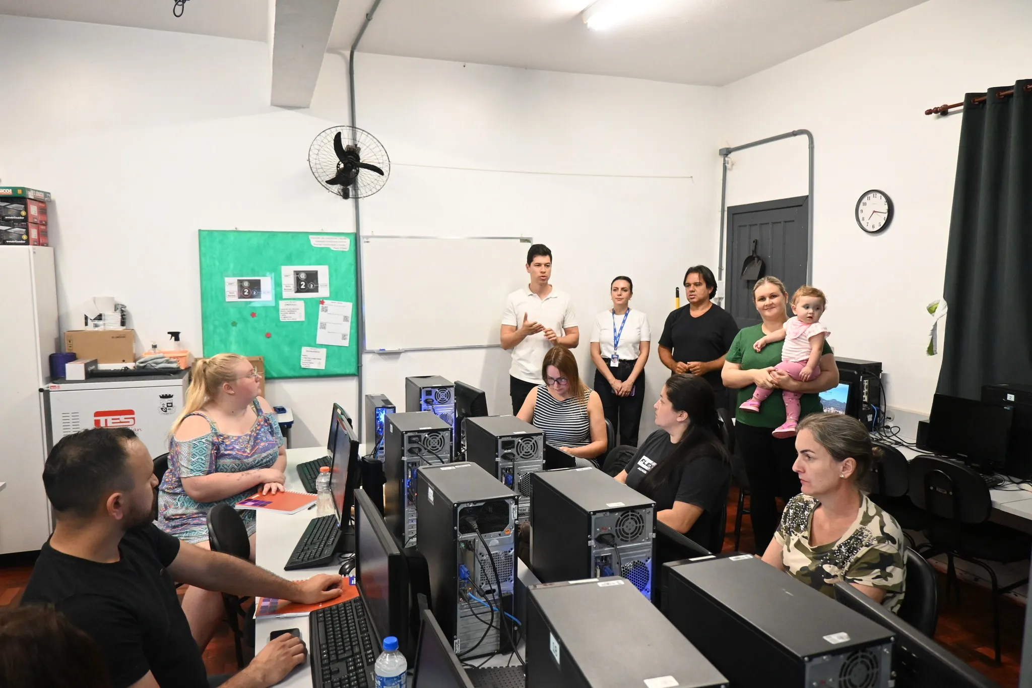 A abertura contou com a presença do secretário de Desenvolvimento Social e Habitação, Ederson Arantes Bueno, e da coordenadora do Sine, Ivete Rambo, ao lado de representantes do SENAI.