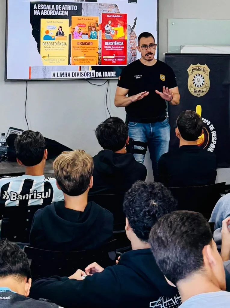 Porto Alegre – Na tarde desta sexta-feira, 10 de abril de 2026, o Centro de Treinamento do Grêmio, em Eldorado do Sul, recebeu uma edição do programa “Papo de Responsa”, promovido pela Polícia Civil, com foco na conscientização de jovens atletas das categorias de base do clube.