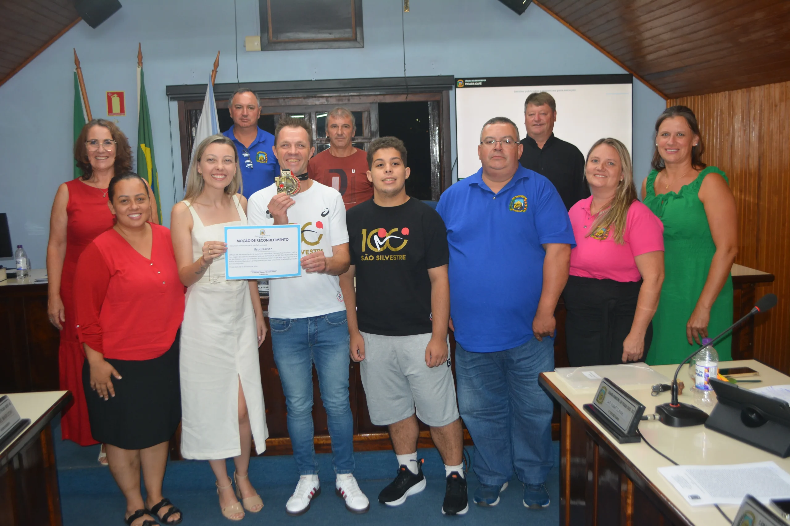 Ilson Kaiser nasceu e cresceu em Picada Café, onde há 11 anos treina para corridas, tendo conquistado mais de 350 títulos entre medalhas e troféus. Somente em 2025 participou de 18 competições no Estado, levando o nome de Picada Café para 13 pódios. Para atingir esses resultados, o atleta percorreu um total de 2.400 km nos treinos somente em 2025, o que demonstra a paixão e dedicação pelo esporte. No final do ano, Ilson levou pela 2ª vez a bandeira da Cidade dos Lírios para a 100ª Corrida Internacional de São Silvestre. “Com determinação e resistência, conquistou a 281ª posição na classificação geral entre mais de 53 mil participantes e obteve o 61º lugar em sua categoria, na qual estavam quase 5 mil corredores”, detalhou a Câmara. Em 2026, participou da Rústica de Verão de Picada Café, que ocorreu em janeiro, onde ficou vice-campeão na modalidade de 5 km, e marcou presença na Travessia Torres Tramandaí (TTT), no quarteto masculino, tendo conquistado a 10ª colocação. A homenagem foi prestada pela presidente Franciele Simon Dielh. Ela explica que o objetivo é reconhecer o esforço do cafeense. “Ele corre cedo, no frio, no silêncio, sempre com disciplina e dedicação. Suas conquistas levam o nome de Picada Café”, detalhou. Ao final o atleta se pronunciou e agradeceu cada palavra de carinho e incentivo. “Carrego Picada Café com orgulho para cada lugar. Esse reconhecimento é um estímulo muito grande”, frisou.