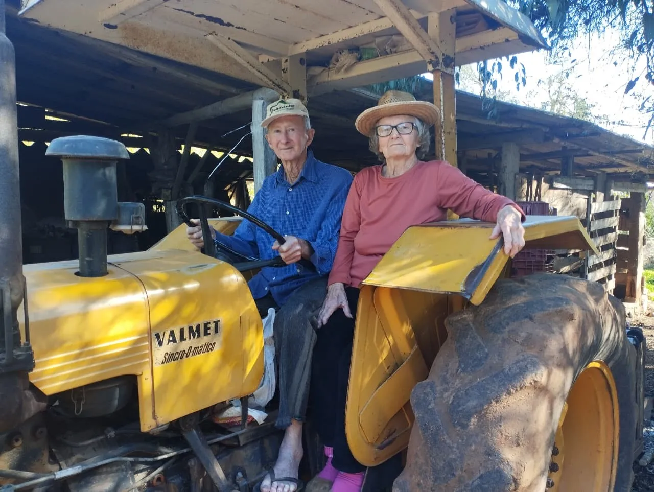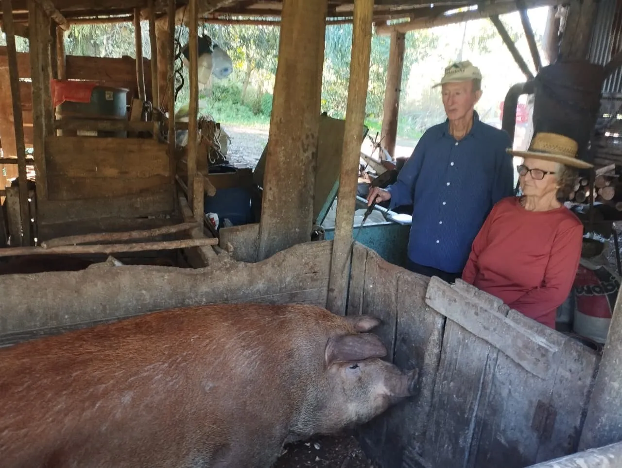 Lindolfo Collor – Os produtores rurais de 14 Colônias, Guido Würzius, 85, e a esposa Nélia Maria, 82, vão completar 63 anos de casados no final deste mês. Ambos nasceram no meio rural e garantem que querem continuar até os últimos dias na roça. O produtor lembra que os antepassados usavam juntas de bois para arar a terra, e destaca a importância do trator para agilizar e facilitar o serviço. Um dado curioso é que eles criaram uma porca da raça Duroc que já está com quase 300 quilos. Eles são pais de Paulo José, 61, e Joãozinho, 58, e avós de Felipe, Tamires e Vítor.