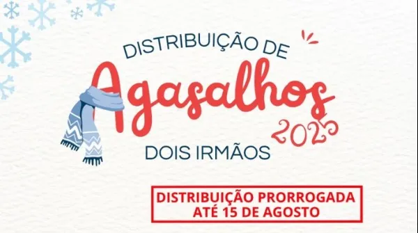 A Campanha do Agasalho 2025, promovida pela Administração Municipal de Dois Irmãos, por meio da Secretaria de Desenvolvimento Social e Habitação, teve o período de distribuição prorrogado até o dia 15 de agosto. A entrega de roupas e cobertores acontece no Departamento de Assistência Social (Avenida São Miguel, 453 – Centro), nas segundas, terças, quartas e quintas-feiras, das 13h às 17h.