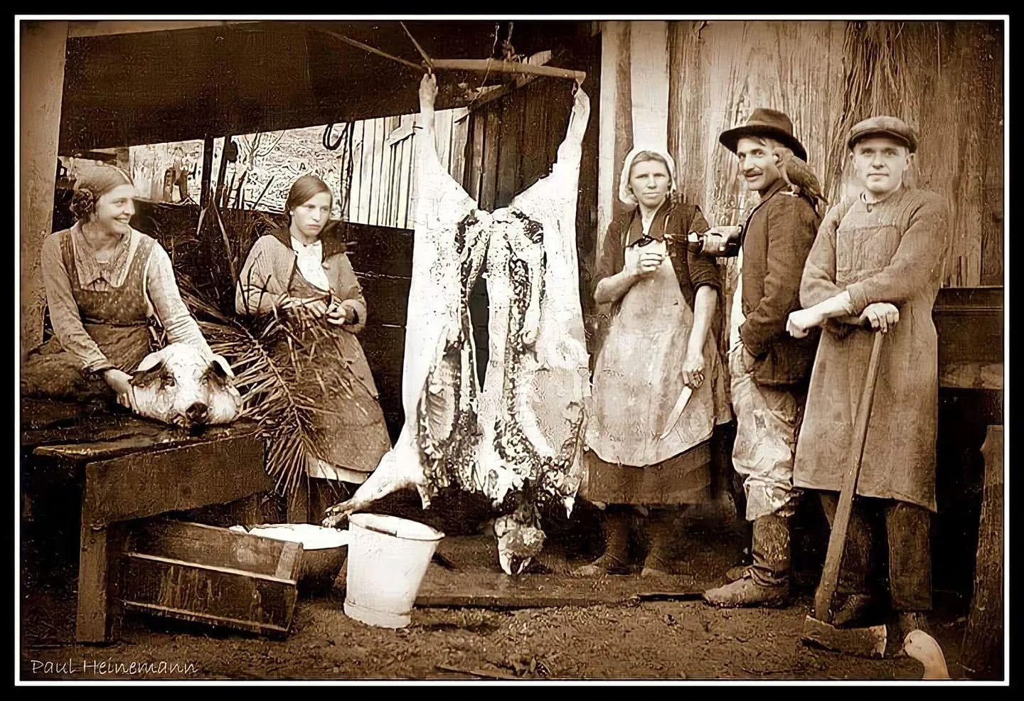 Acervo de Germano Schüür. Dia de carneação do porco, família trabalhando unida